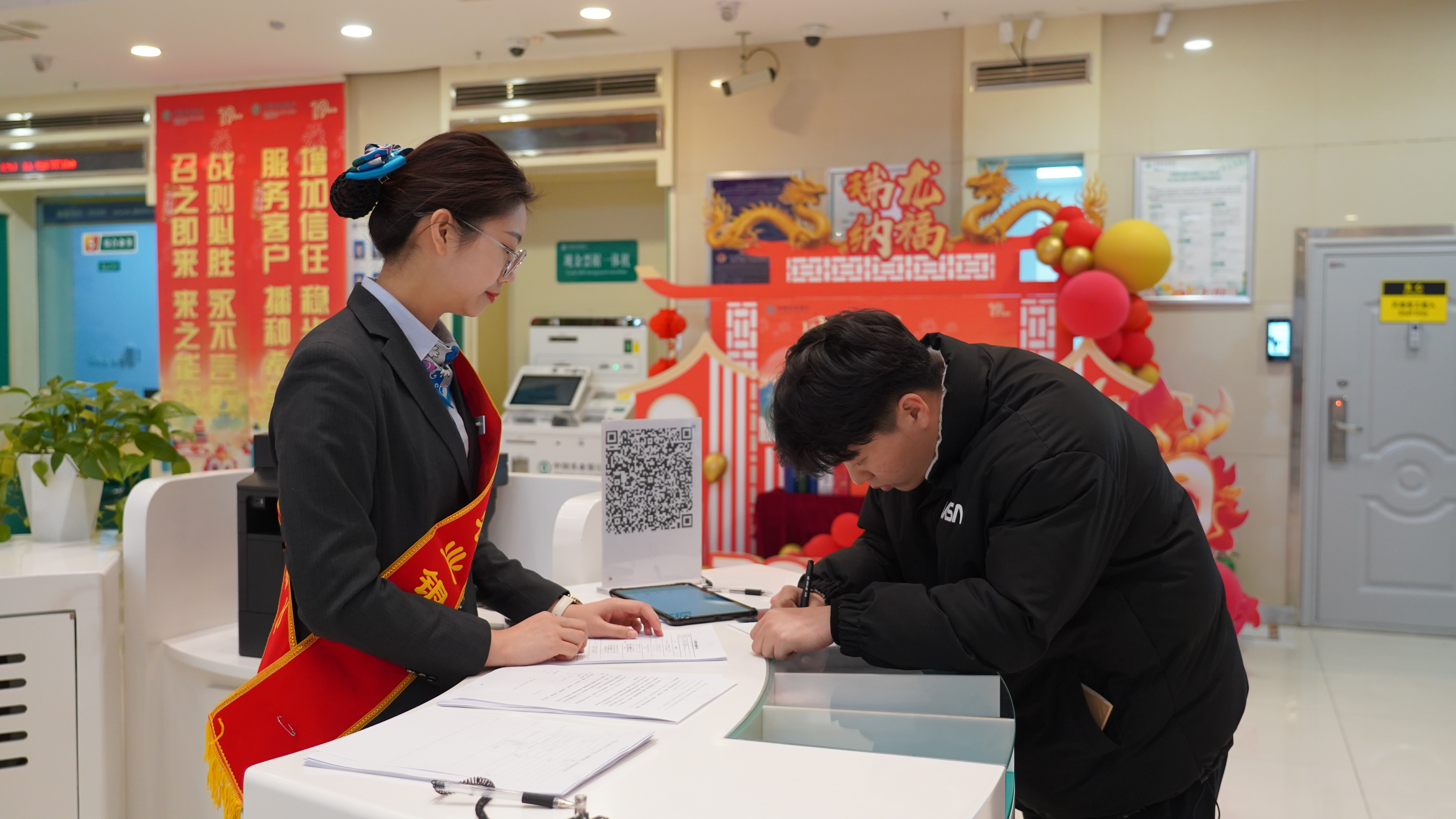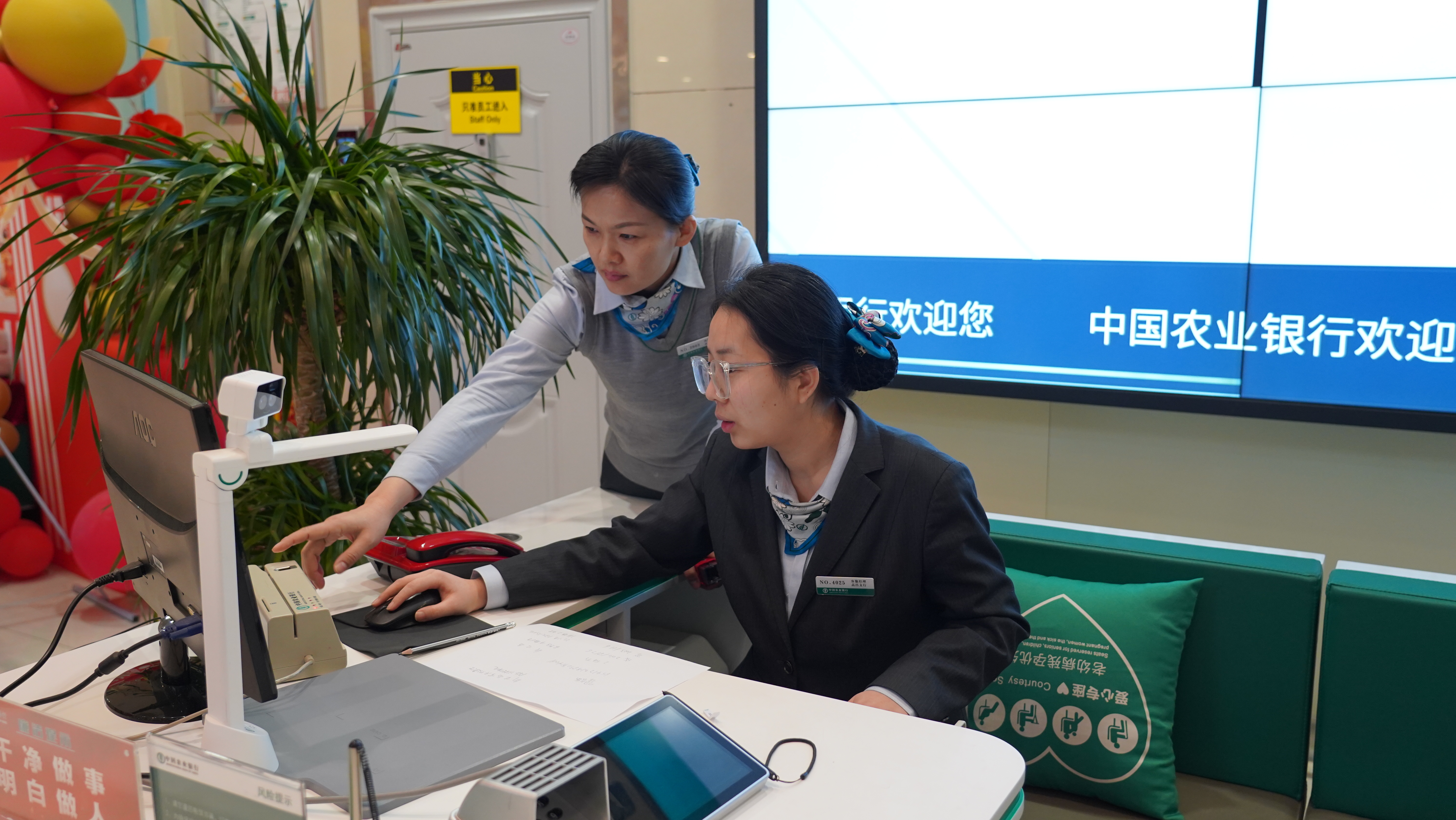 在农行吐鲁番分行营业网点,工作人员引导客户办理贷款业务。