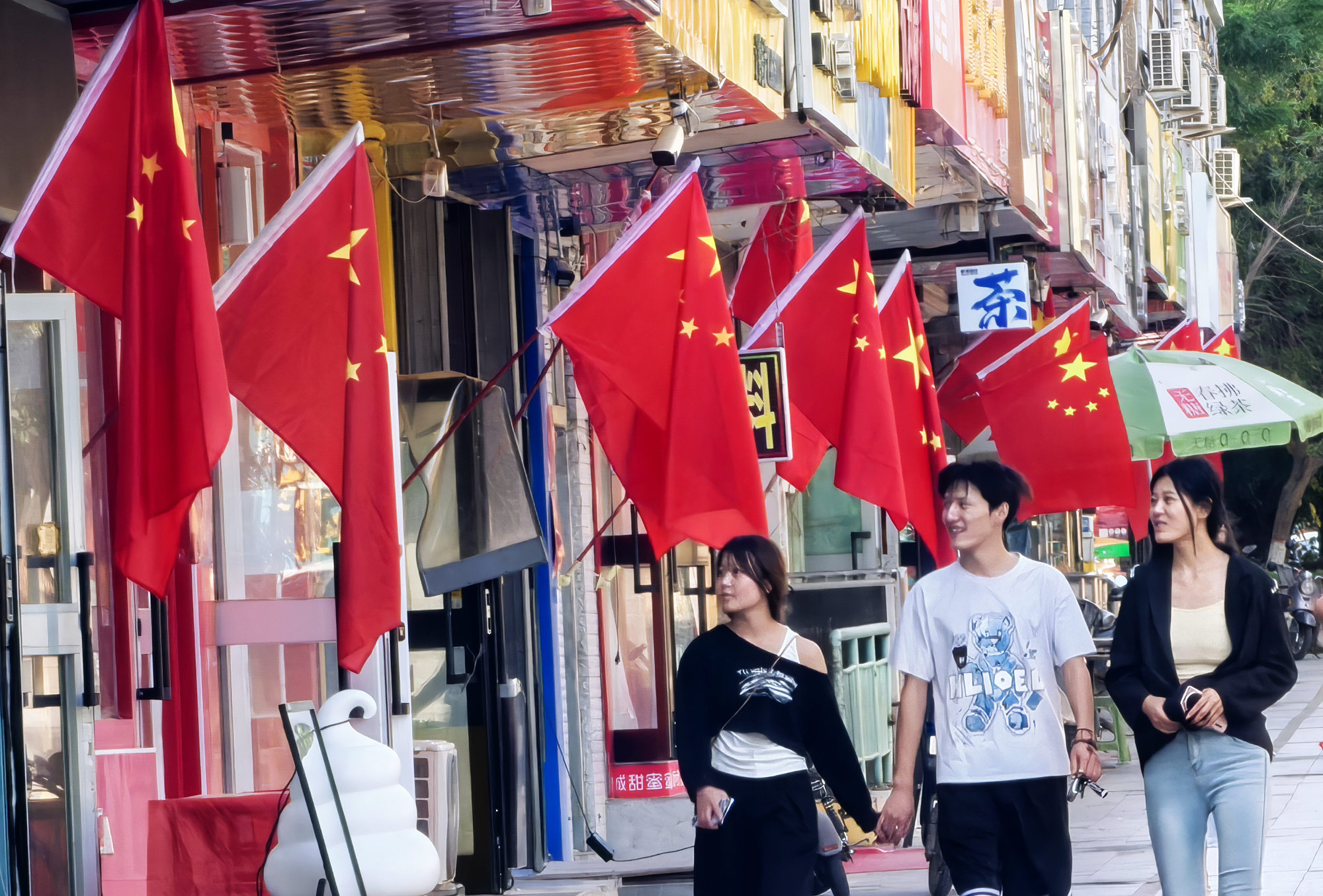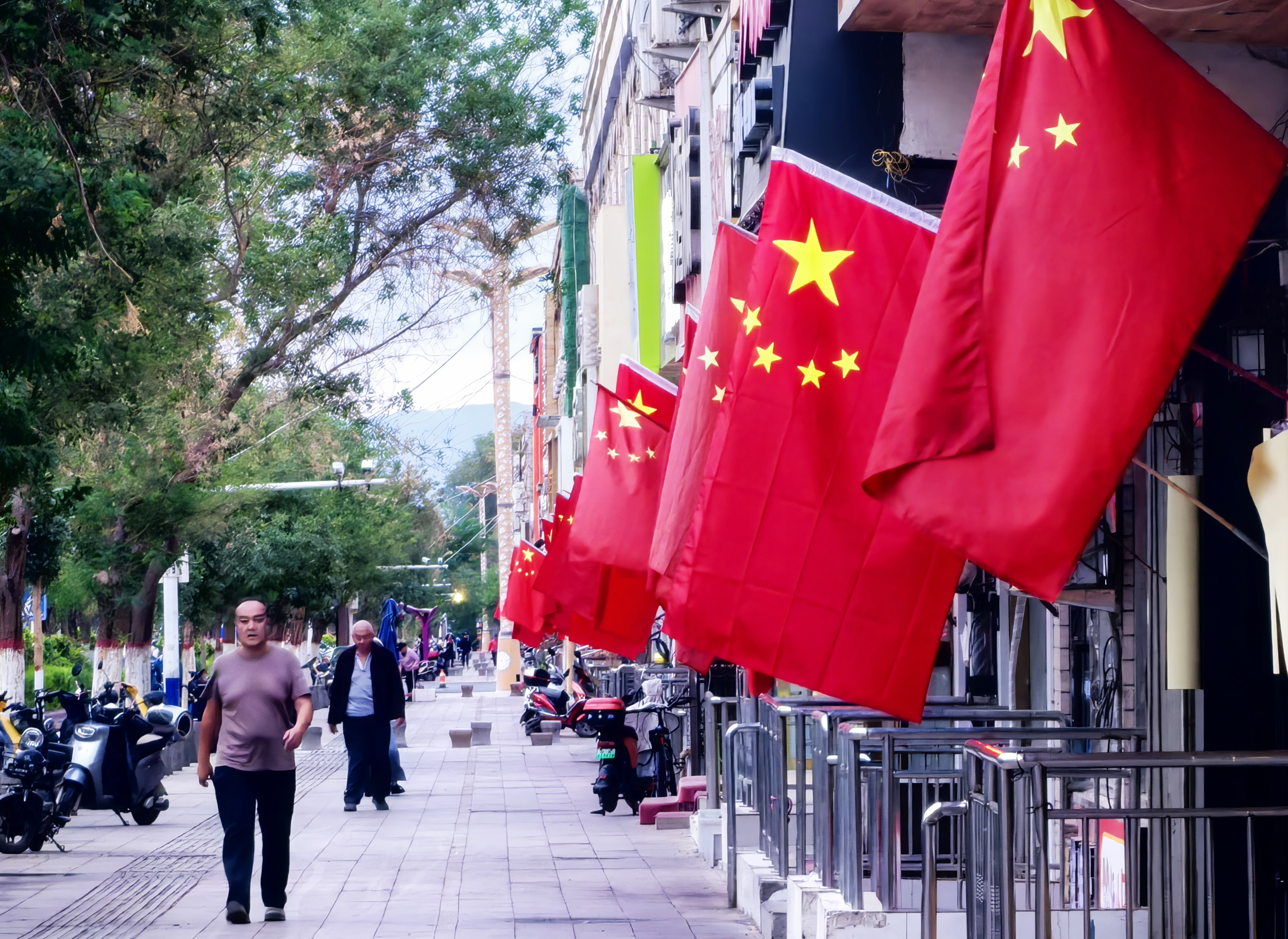 在高昌区柏孜克里克路,市民从悬挂五星红旗的商铺前走过。 吐鲁番市融媒体中心记者 刘健 摄
