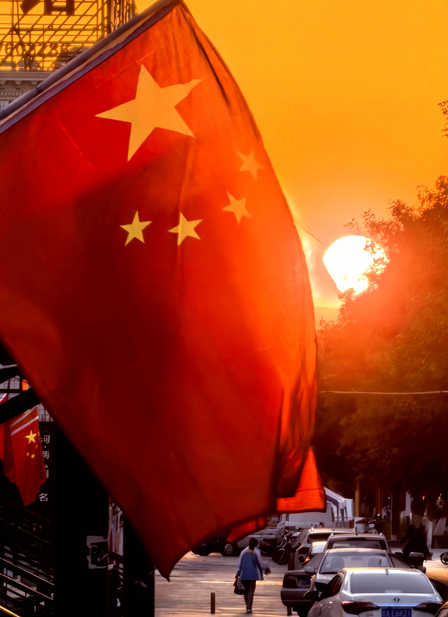 清晨,阳光映照着高昌区街头悬挂的五星红旗,庄重而祥和。 吐鲁番市融媒体中心记者 刘健 摄