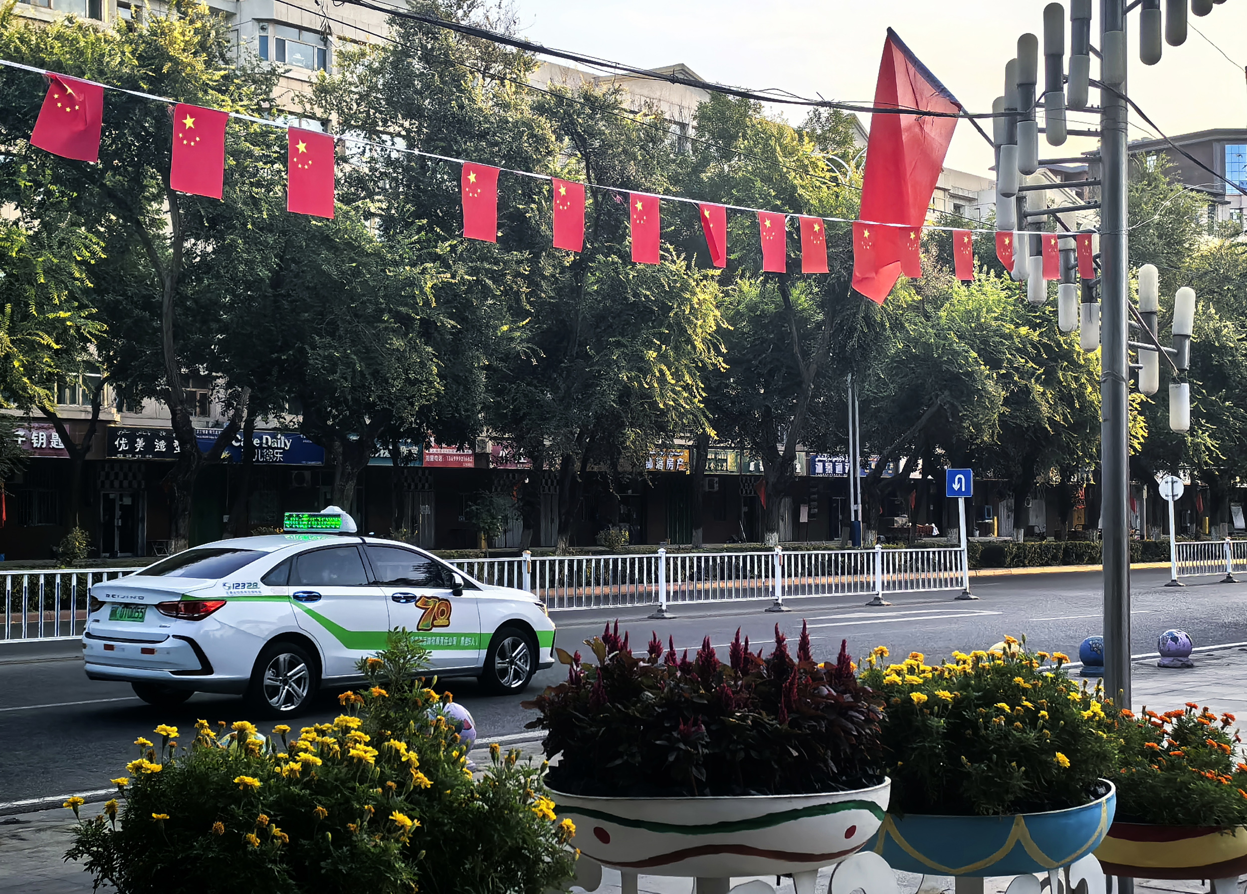 一辆出租车行驶在高昌区悬挂着五星红旗的街道上,流动的车辆与飘扬的旗帜构成了节日里独特的风景线。 吐鲁番市融媒体中心记者 刘健 摄