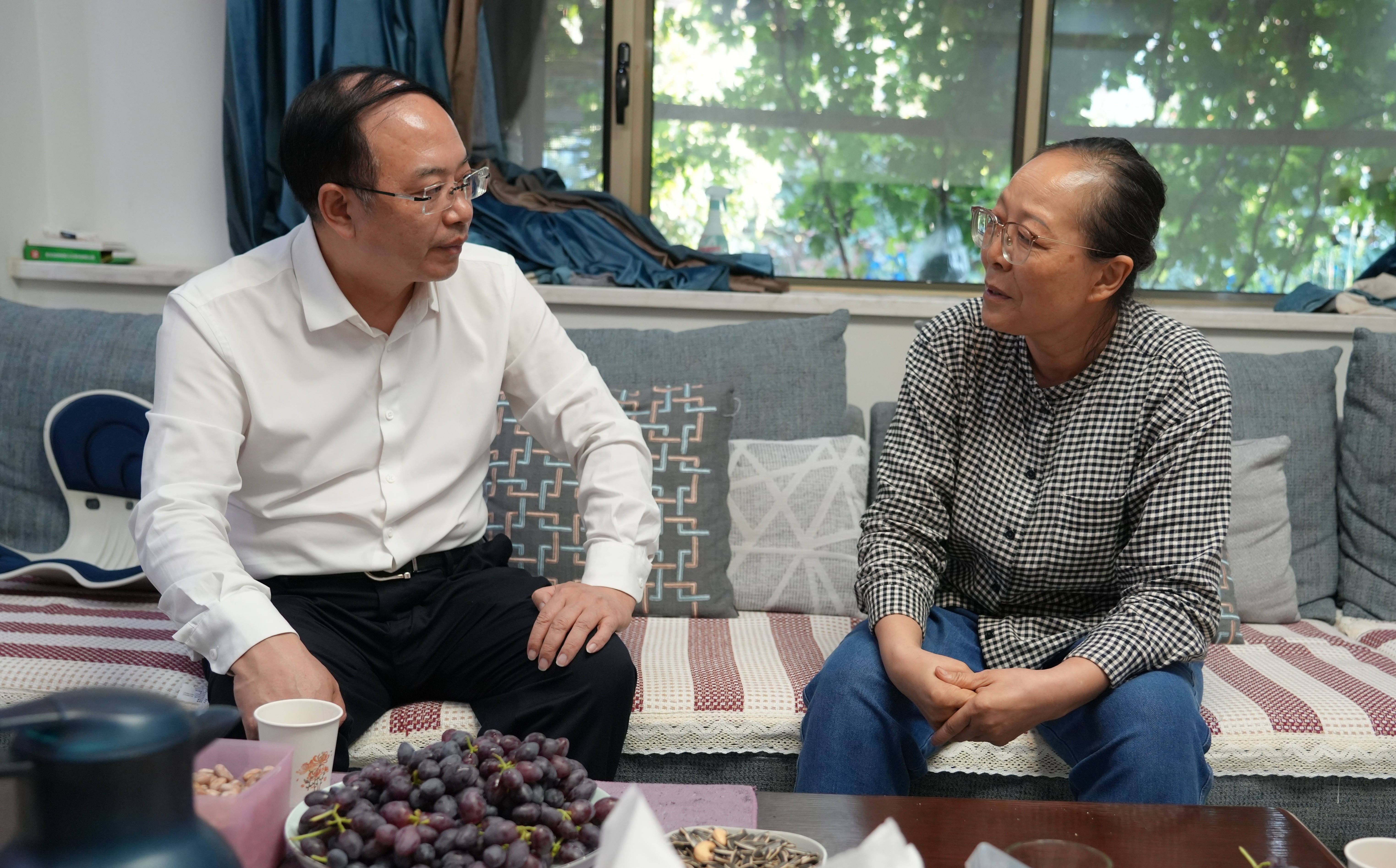 9月29日下午,在师小华家中,文天平与她聊家常、忆往昔、话发展。吐鲁番市融媒体中心记者 李彦强 摄