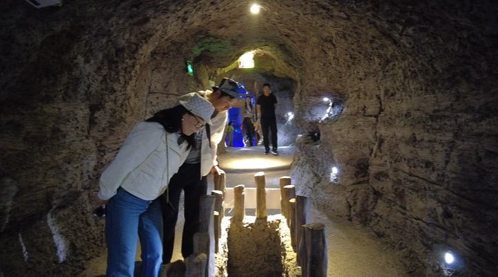 走进景区,入口处主题屏幕与艾德莱斯绸装饰营造出喜庆氛围。游客沿暗渠前行,观察竖井、明渠构造,触摸清凉井水,感受“地下长城”的独特魅力。