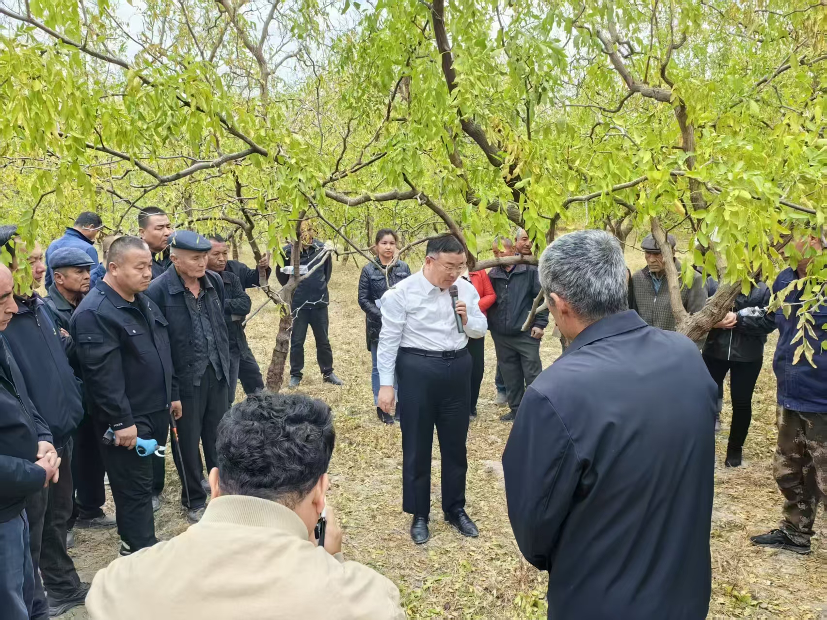 2025年3月20日,吐鲁番干旱经济林援疆“小组团”团长、中南林业科技大学林学院教授王森同志(中间),在托克逊县枣林指导种植户提高坐果率。
