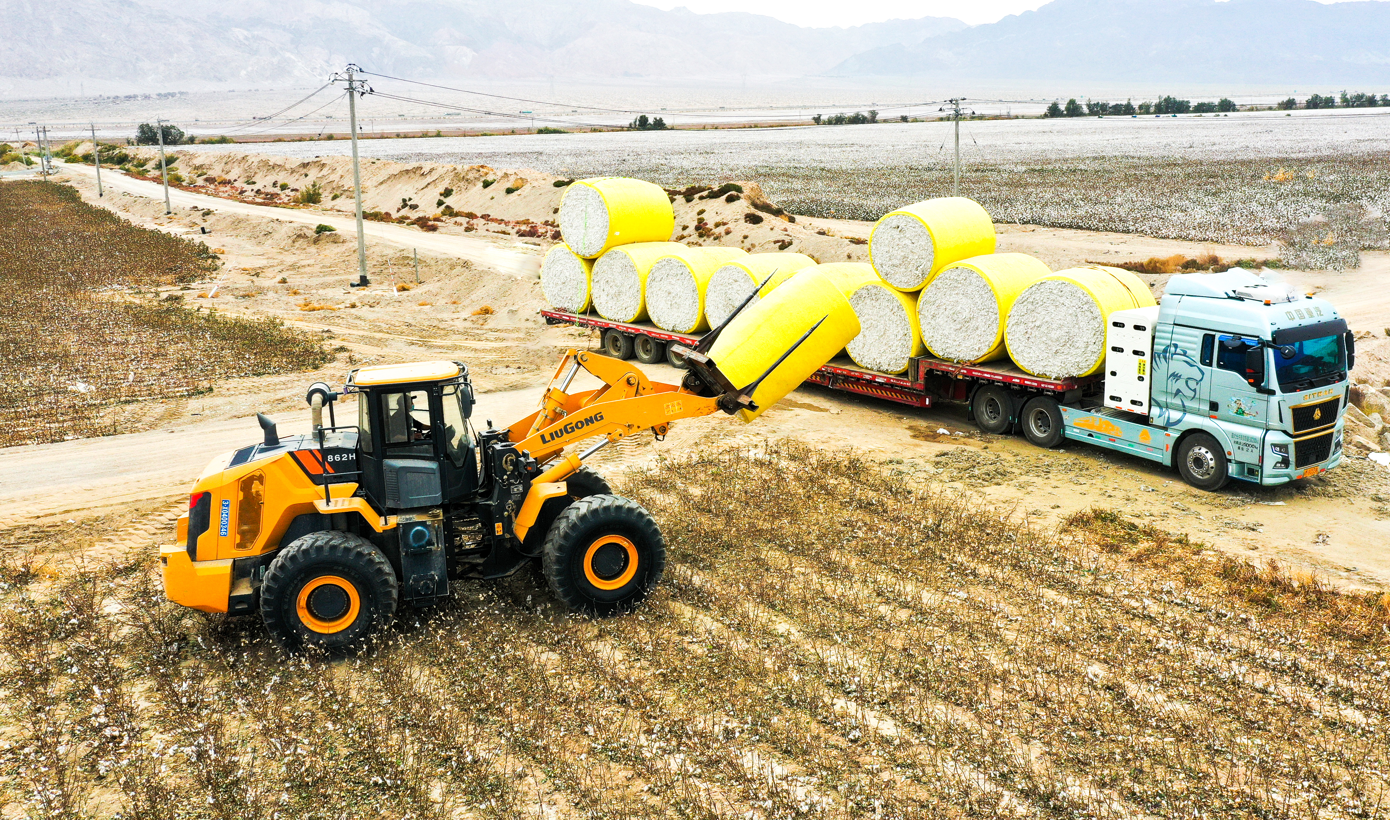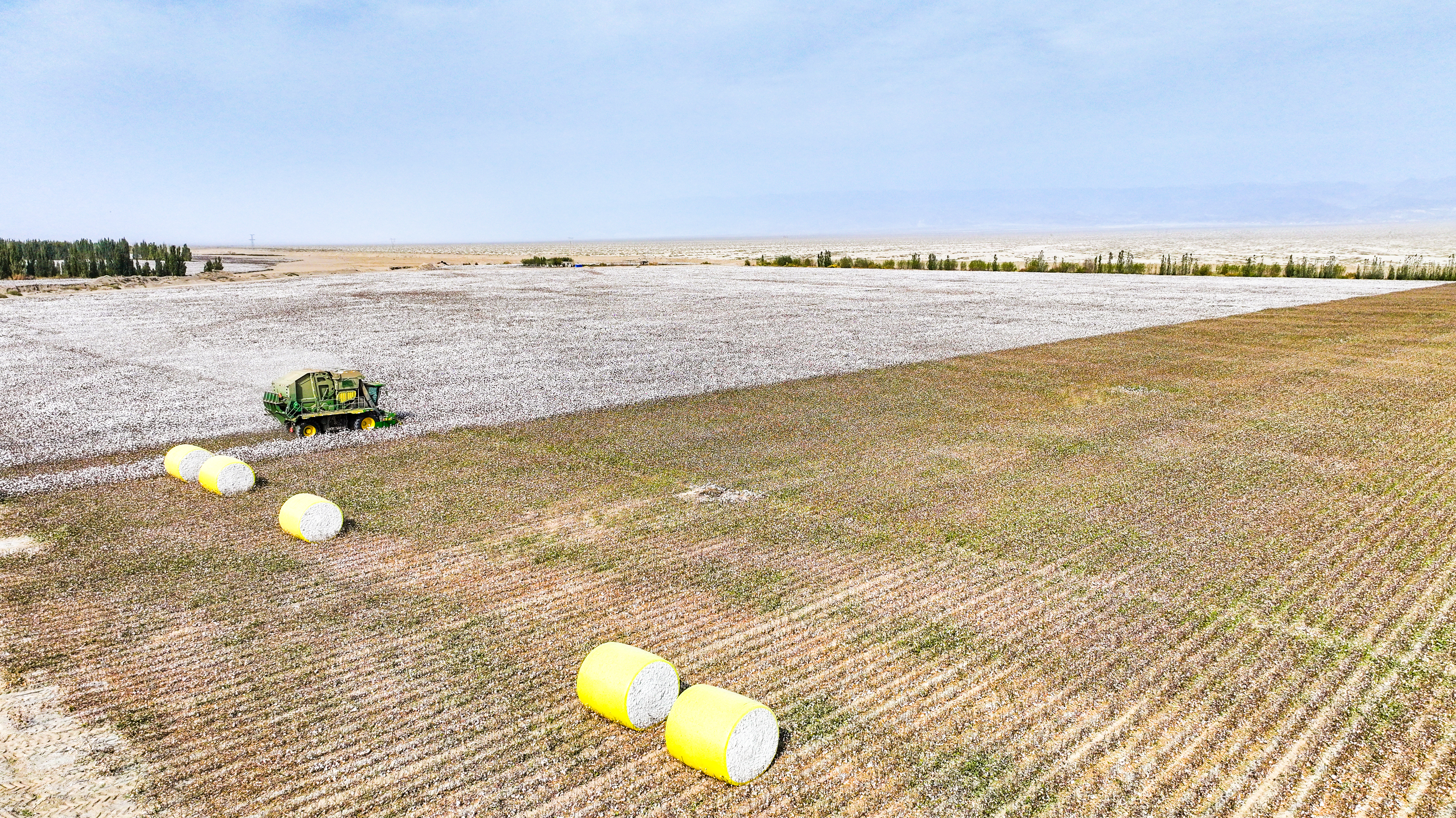 10月13日,在库米什镇柯尔克孜铁米村的棉田里,大型采棉机来回驰骋,产下一个个重达2.3吨的“金蛋蛋”。随后,这些棉包被运送到几公里之外的加工厂,完成初步加工。种植户孙万青高兴地说:“往年这个时候,我们最操心的不是采,而是卖和运。现在好了,镇上建起了棉花加工厂,可以直接把棉包送过去。路程短、损耗小、更安全,卖棉花的钱回来得也快,大伙儿心里都踏实多了。”
