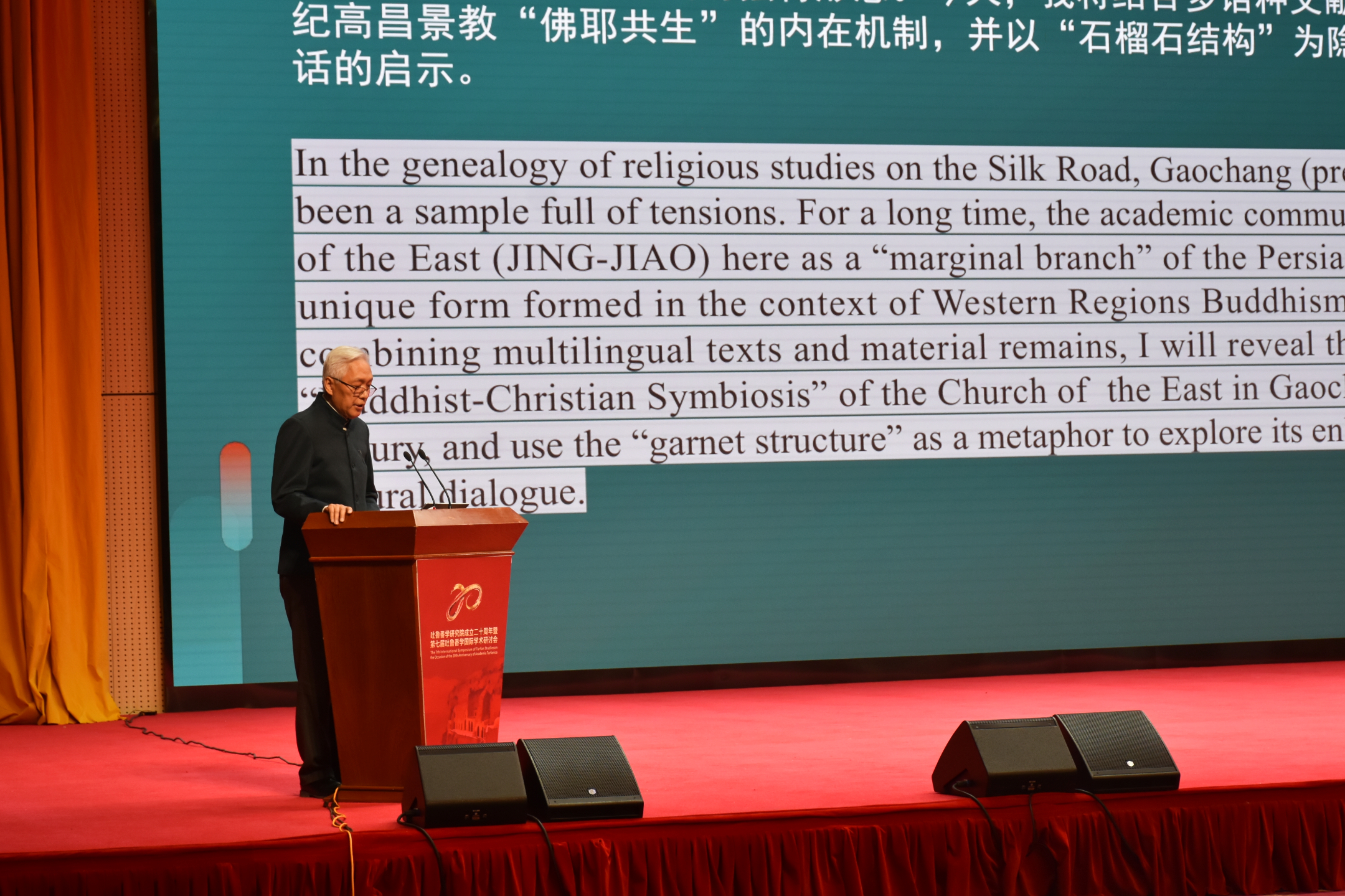 当天,牛汝极以《唐元间高昌景教的“佛耶共生”模式——多语种文献与物质遗存的互证研究》为题作主旨报告,系统阐释了高昌回鹘时期吐鲁番地区佛教与景教等多种宗教并存的研究成果,并提出创新观点,认为高昌回鹘景教呈现“佛耶共生”特点,受到与会学者的广泛认可。