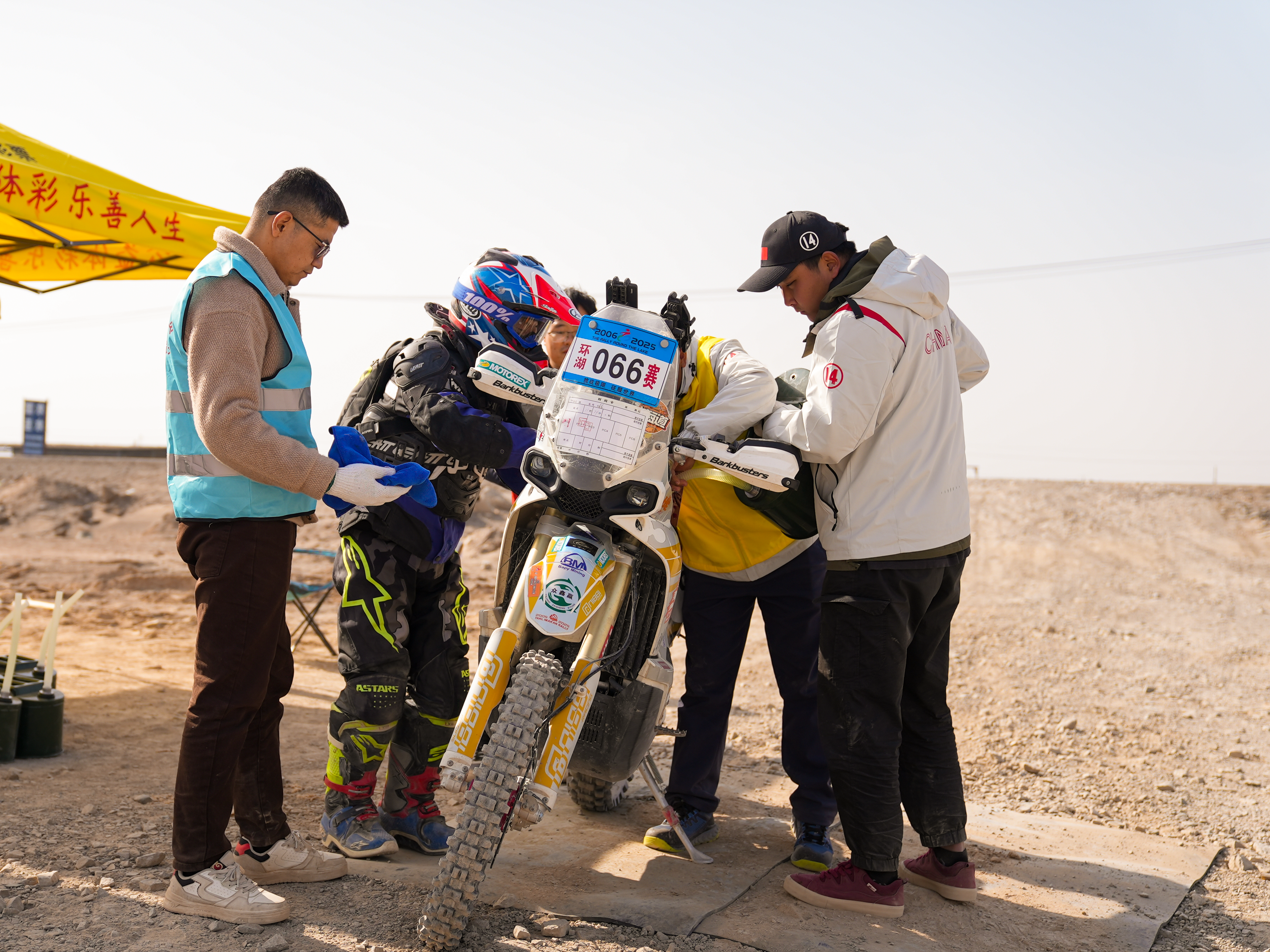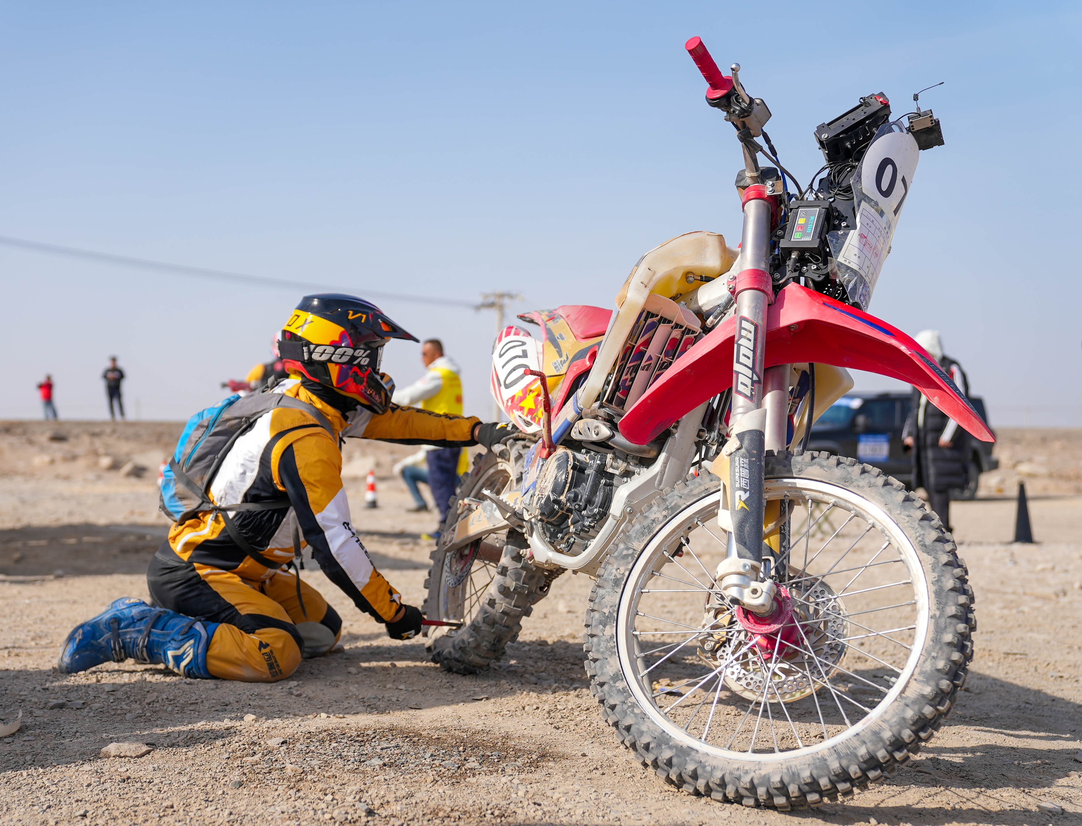 参赛选手在补给点维修车辆。吐鲁番市融媒体中心记者 木塔力甫 摄