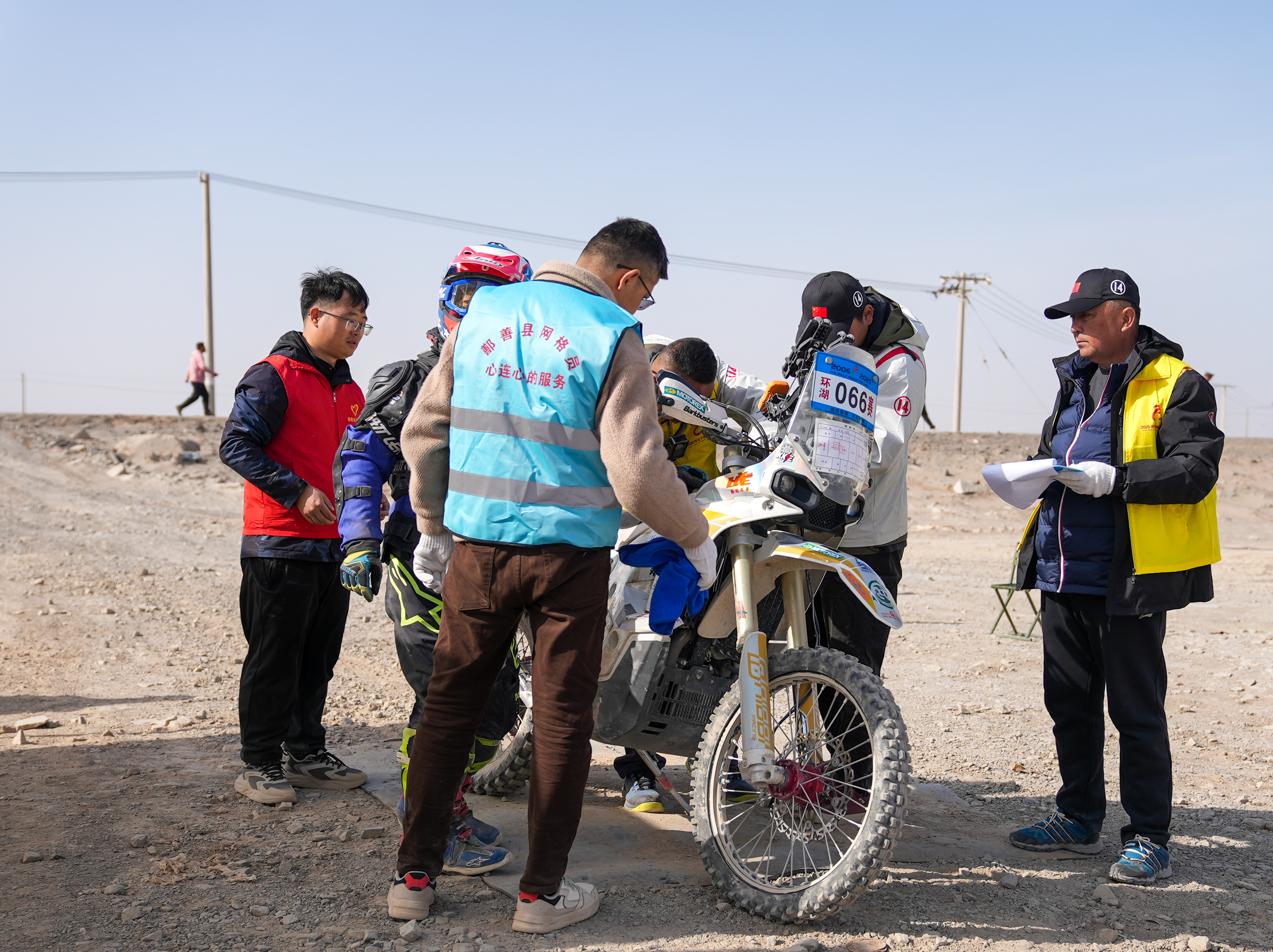 参赛选手在补给点检查车辆。吐鲁番市融媒体中心记者 木塔力甫 摄