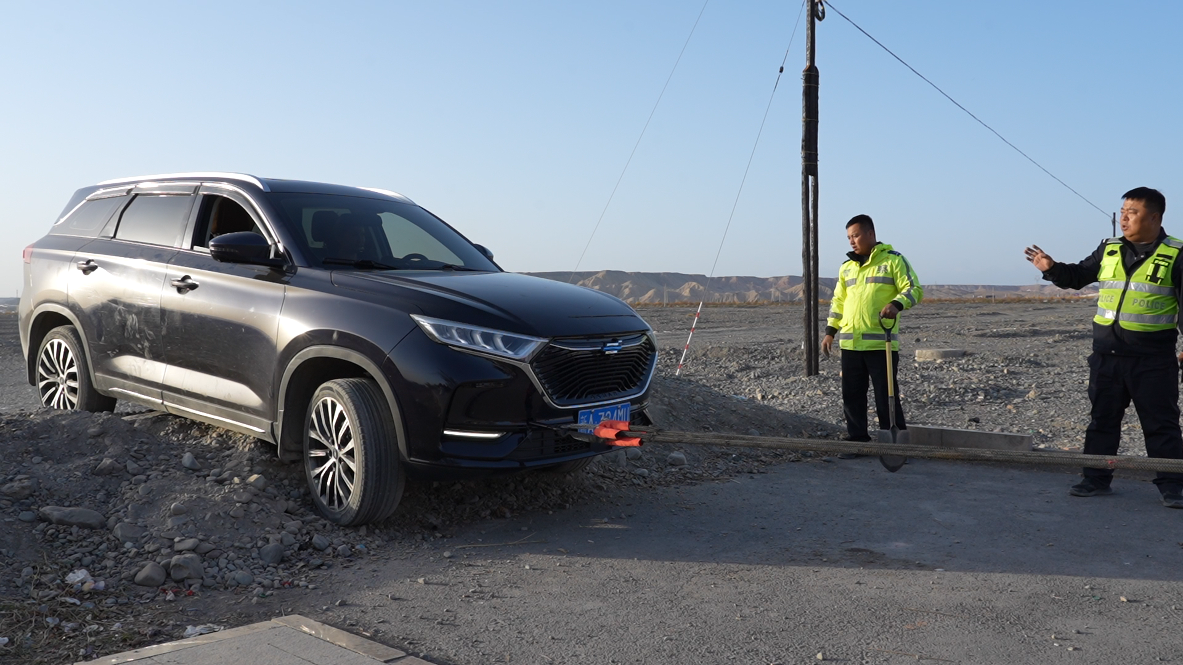穆妮热·艾尔肯说:“我们从乌鲁木齐过来玩,不熟悉路况,开着导航走。前面的道路被封了,我看到戈壁滩这边有车轮印子,觉得车可以开上来,没想到被卡住了。车辆被困后,只好打电话报警求助。”