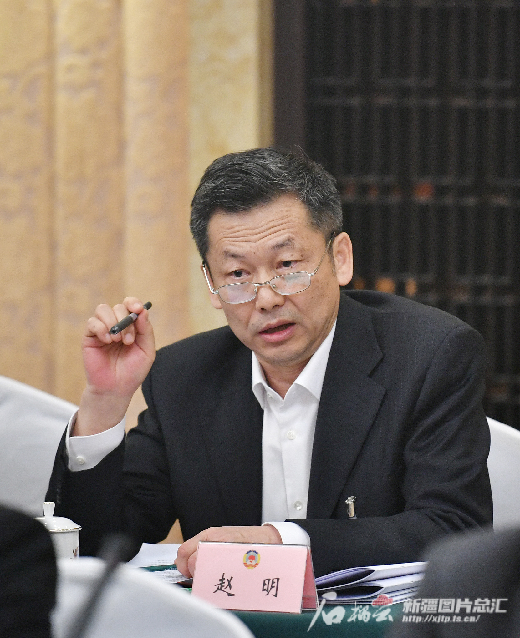 1月30日,赵明委员在分组讨论时,围绕人工影响天气和科学利用水资源等内容发言。石榴云/新疆日报记者 邹懿摄