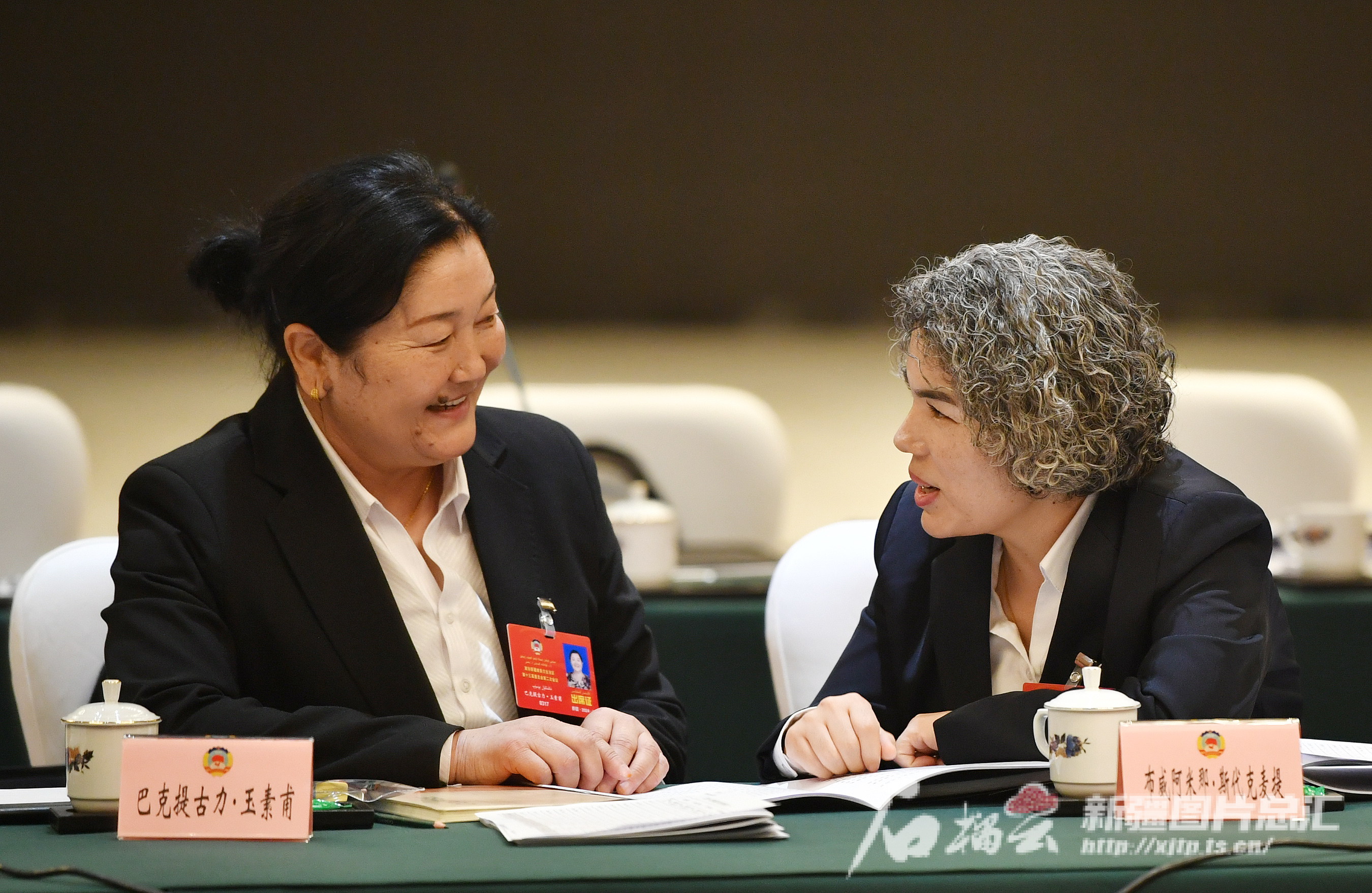 1月30日,巴克提古力·玉素甫委员(左)和布威阿米那·斯代克麦提委员在分组讨论间隙,围绕加强青少年教育等内容交流。石榴云/新疆日报记者 邹懿摄