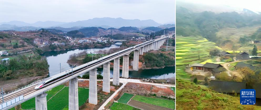 拼版照片:左图为2025年2月8日,陆锦胜驾驶的动车组列车从贵南高铁贵州都匀段营盘清水江双线特大桥上驶过(新华社发 龙建睿 摄,无人机照片);右图为贵州都匀市匀东镇明英村曾经的泥土串户路(资料照片)。