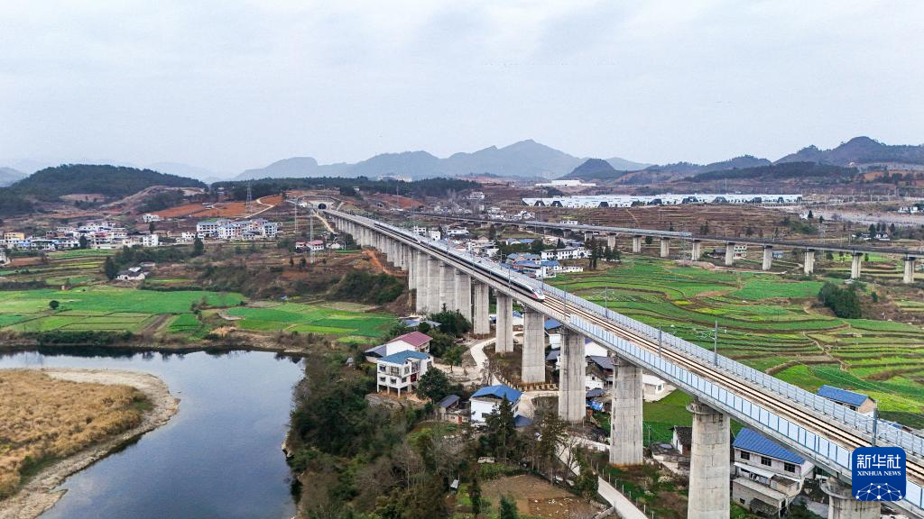 2月8日,陆锦胜驾驶的G1616次复兴号动车组列车从贵南高铁贵州都匀段营盘清水江双线特大桥驶过(无人机照片)。