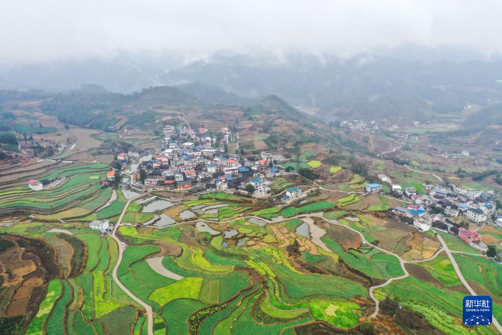 这是2月6日拍摄的贵州省都匀市匀东镇明英村,这里是动车司机陆锦胜的家乡(无人机照片)。