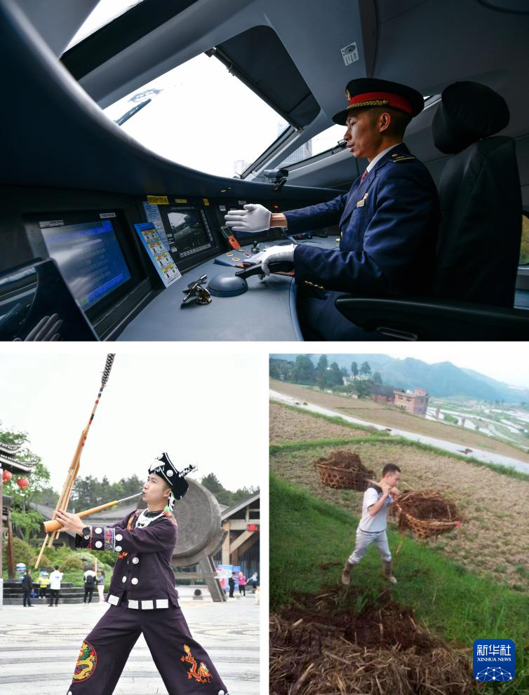拼版照片:上图为2025年2月7日,动车司机陆锦胜驾驶动车组列车在贵南高铁贵州都匀市境内行驶(新华社记者 杨文斌 摄);左下图为2023年5月10日,陆锦胜在贵州丹寨县万达小镇身穿民族服饰吹奏芦笙;右下图为2014年5月31日,陆锦胜在贵州都匀市匀东镇明英村干农活。