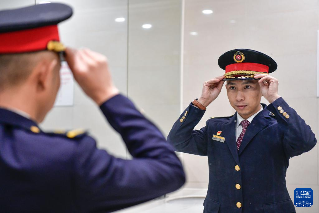陆锦胜出乘前在贵阳机务段动车运用车间贵阳北派班室里整理着装(2月7日摄)。