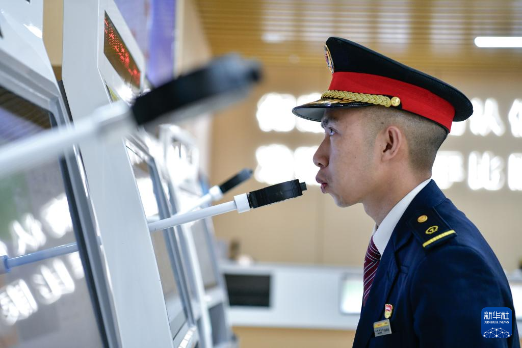 在贵阳机务段动车运用车间贵阳北派班室,陆锦胜在出乘前进行酒精吹气测试(2月7日摄)。