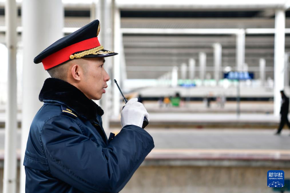 陆锦胜在贵阳北站站台用对讲机与当班值乘的列车长通话(2月7日摄)。