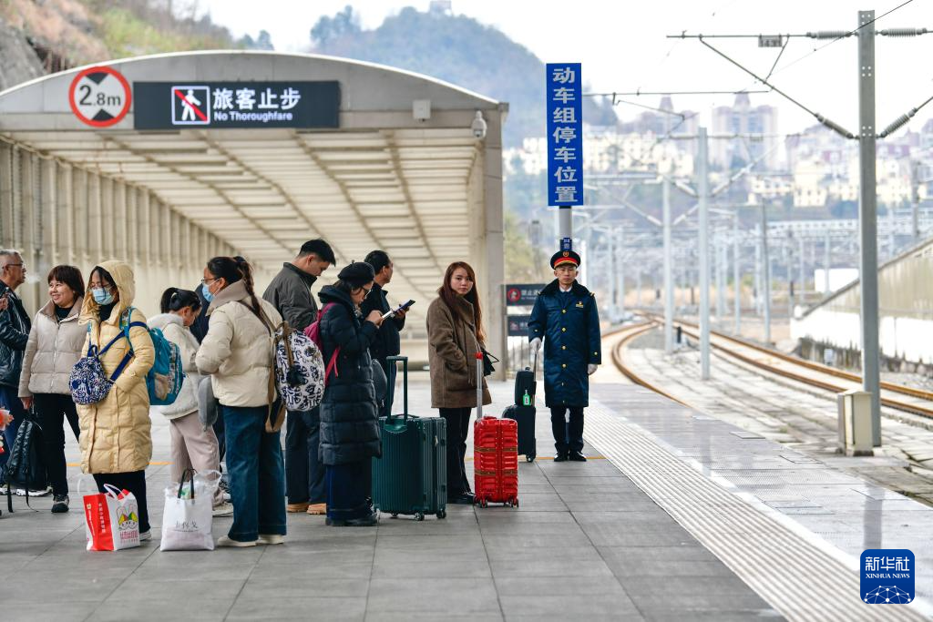 陆锦胜(右一)在贵阳北站站台等待列车进站(2月7日摄)。