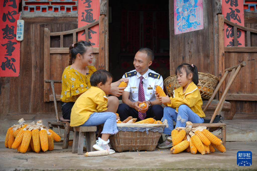 在贵州省都匀市匀东镇明英村,陆锦胜和妻子、孩子们在自家院子里剥玉米(2023年8月23日摄)。
