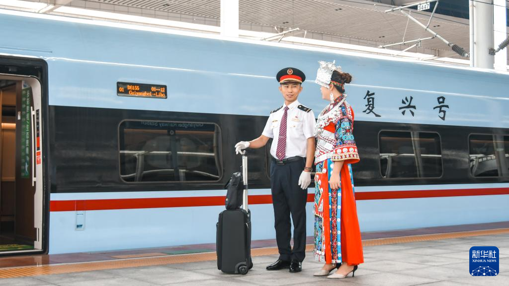 在贵阳北站,陆锦胜与妻子一起参加贵南高铁贵州段开通运营首发活动(2023年8月8日摄)。