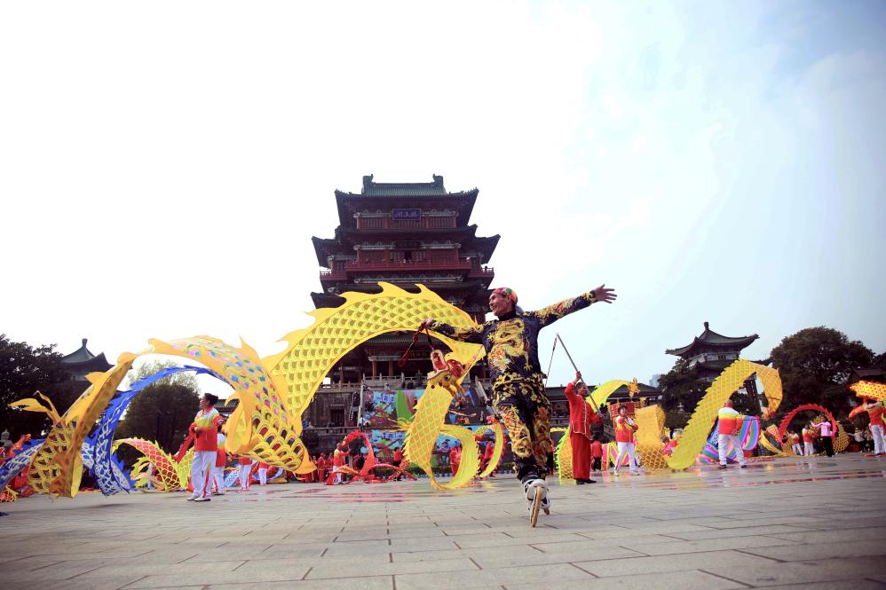 图为熊福根在滕王阁下踩着轮滑表演彩带龙。新华社记者 袁慧晶 摄