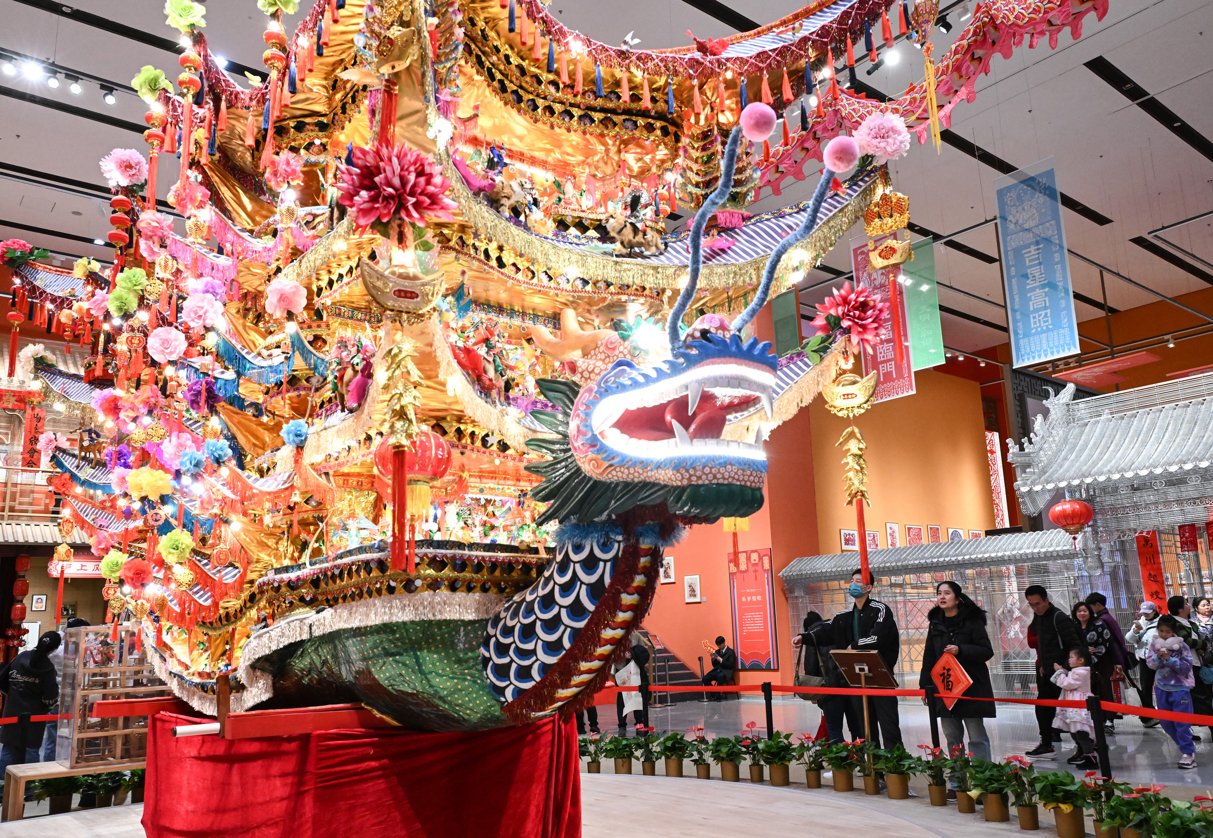 2024年12月21日,观众在中国工艺美术馆的“过年——春节主题展”参观非遗项目——“龙船灯”展品。新华社记者 李贺 摄
