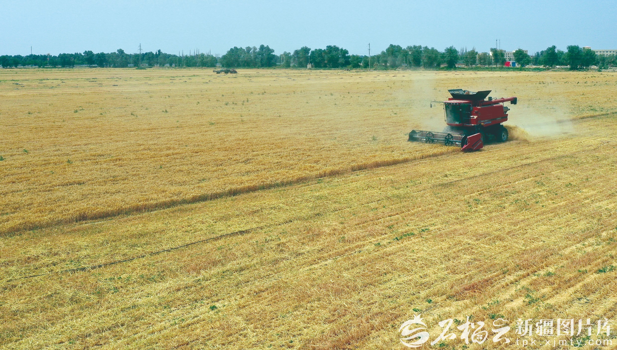 6月24日,小麦收割机在乌苏市西湖镇西湖村收割小麦。韩亮摄