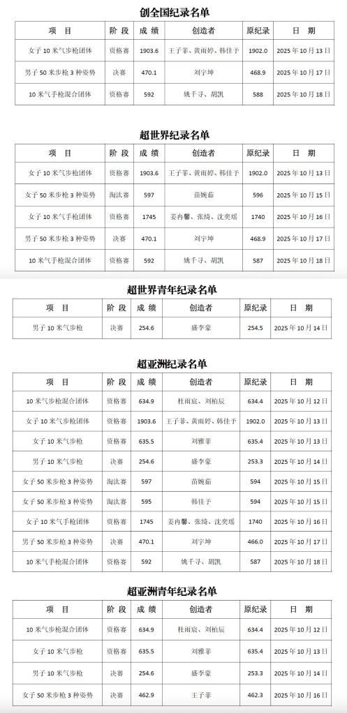 以上5个项目中,女子10米气步枪团体、男子50米步枪三姿决赛和10米气手枪混合团体刷新了全国纪录。