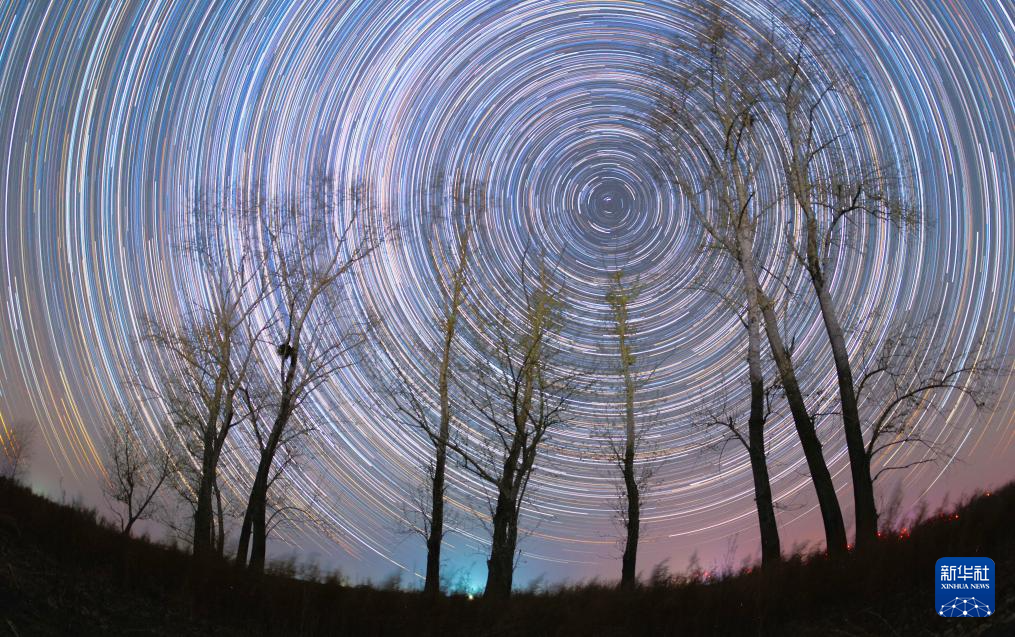 10月31日在黑龙江省富锦市拍摄的秋日星空下的秋树(堆栈合成照片)。新华社发(庚喜庆摄)