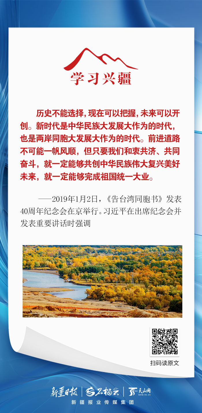 历史不能选择,现在可以把握,未来可以开创。新时代是中华民族大发展大作为的时代,也是两岸同胞大发展大作为的时代。前进道路不可能一帆风顺,但只要我们和衷共济、共同奋斗,就一定能够共创中华民族伟大复兴美好未来,就一定能够完成祖国统一大业。