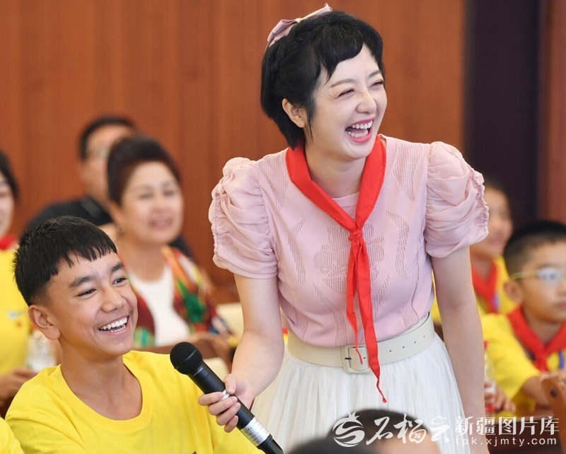 中央广播电视总台主持人杜悦在“石榴籽计划”——我们与海的约定主题研学营开营仪式上采访来自麦盖提县的学生代表(2023年8月4日摄)。石榴云/新疆日报记者 邹懿摄