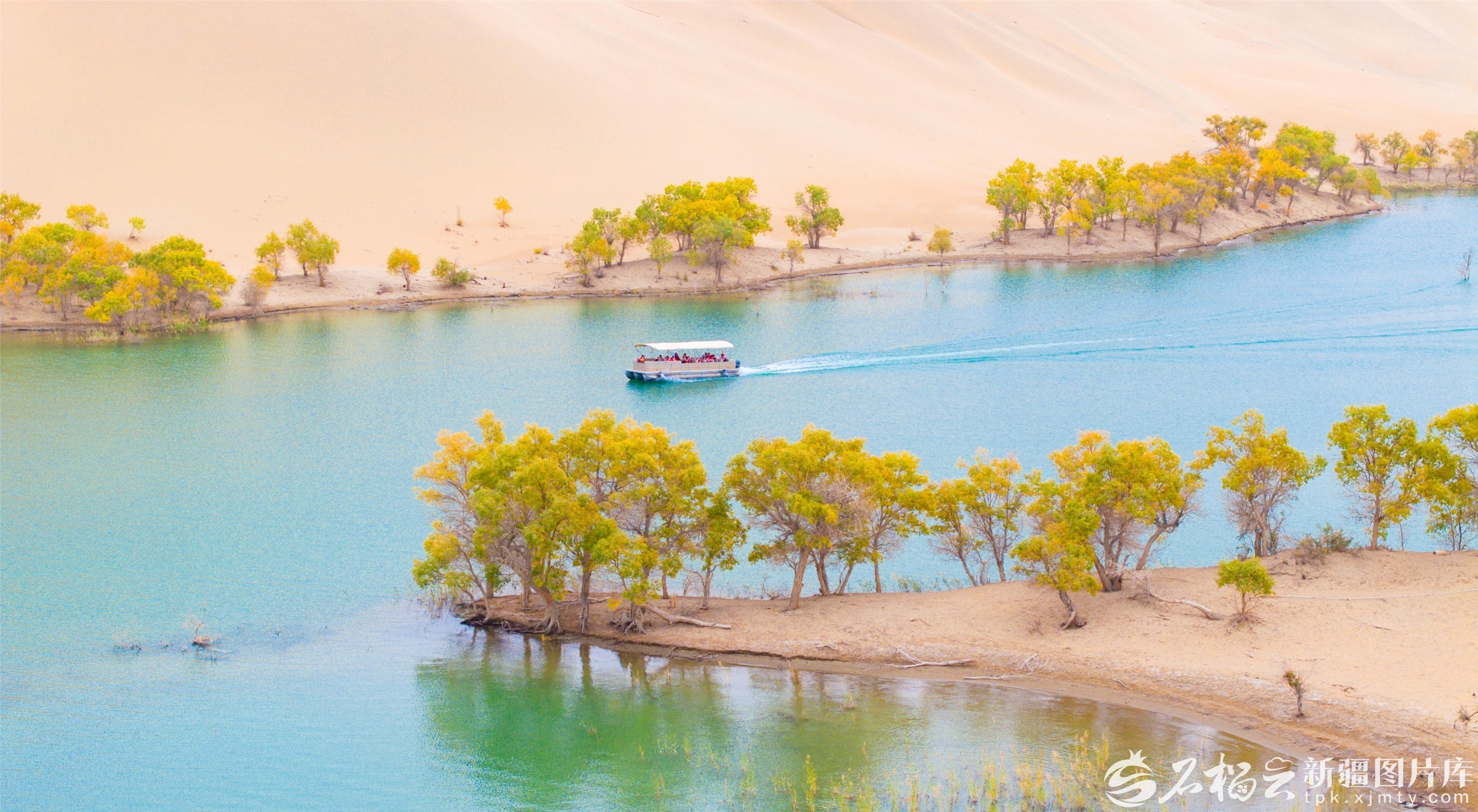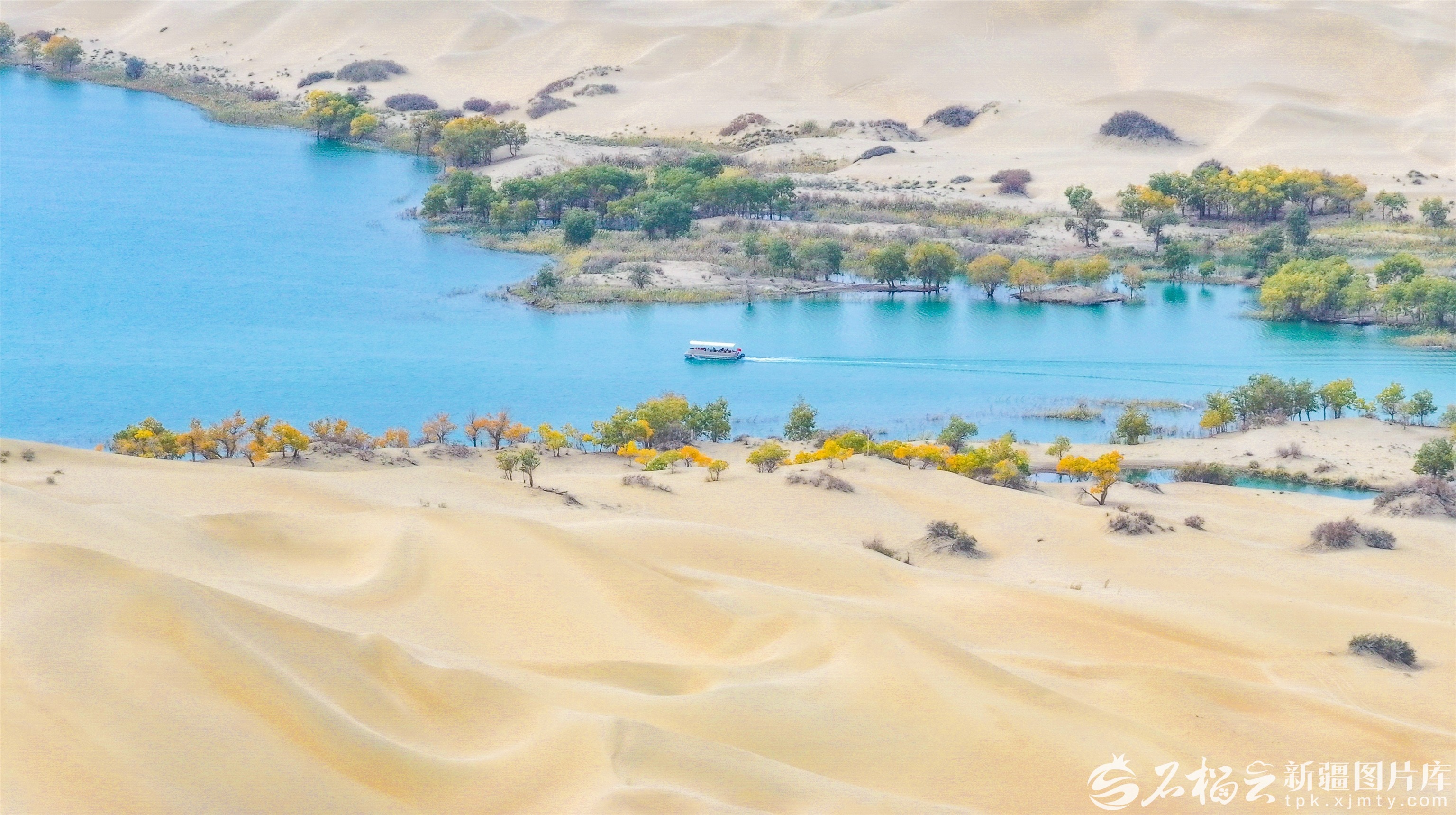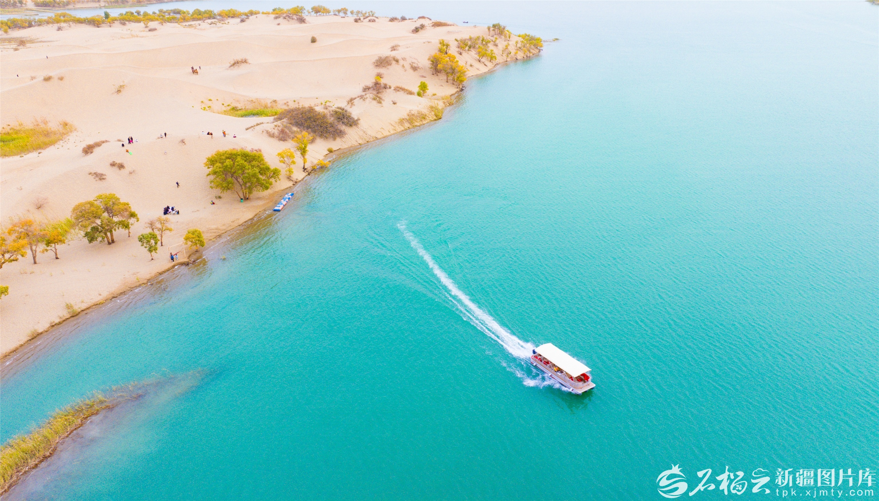 10月8日,游客坐船在位于尉犁县的罗布湖畅游。泛黄的胡杨、湛蓝的湖水、金色的沙丘共同构成一幅山水画卷,游客可在此沉浸式感受秋日美景。汪志鹏摄
