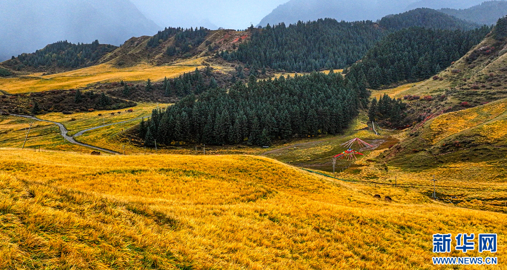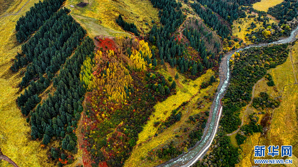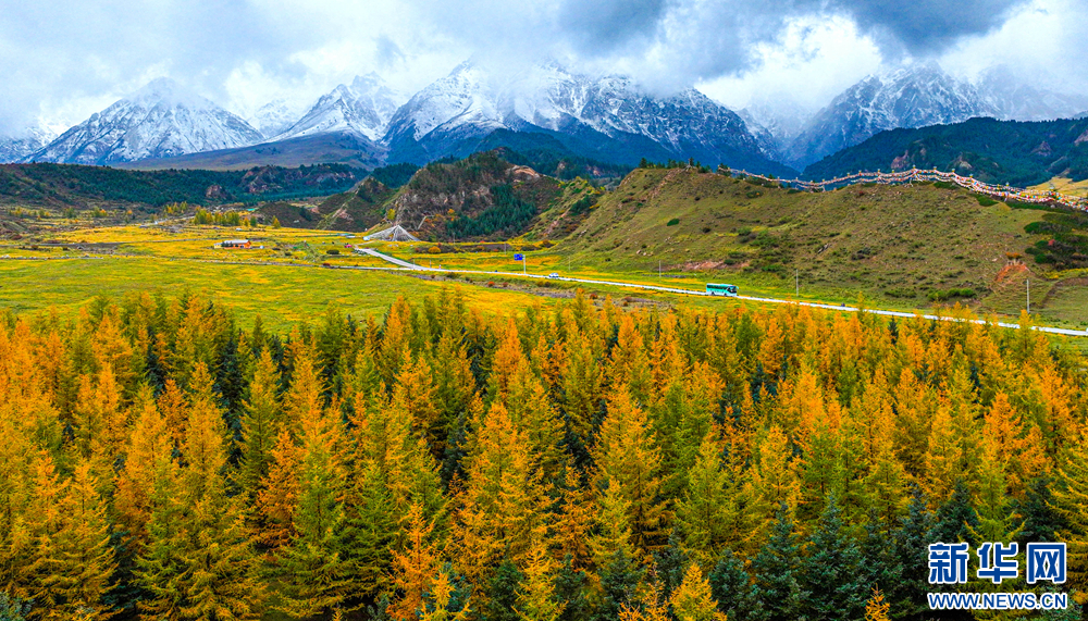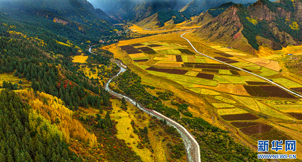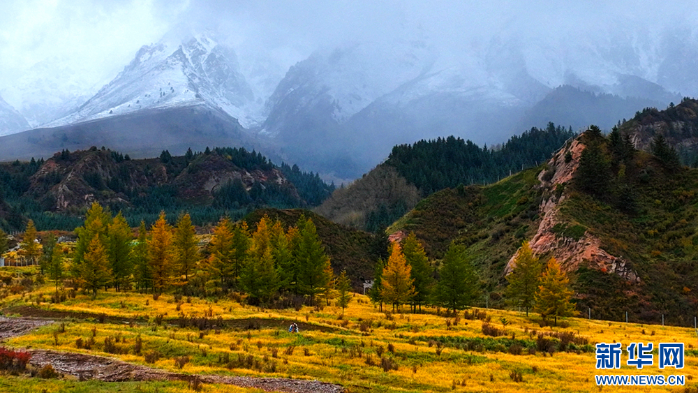 秋日里,祁连山国家公园甘肃省张掖市肃南裕固族自治县马蹄乡段,山顶白雪皑皑,山间云雾缭绕,树木层林尽染,形成色彩斑斓的深秋美景。新华网发(王将 摄)