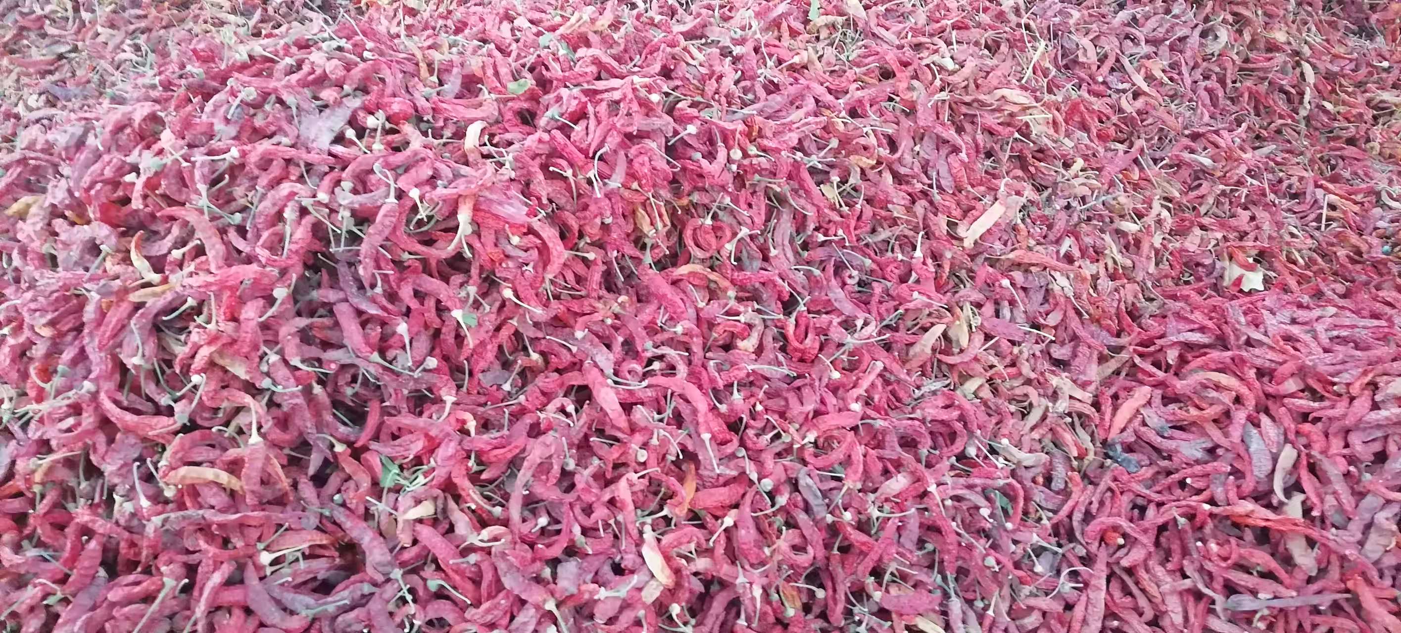 9月至10月的采收季里,田间采摘与车间加工的繁忙景象交织成丰收图景。在新疆金源农业科技发展有限公司的加工车间,总经理姚友军正和负责人刘权围着收购台账交流,鲜红的辣椒经清洗、分拣后,或装袋制成保鲜椒,或装箱准备发运。“今年到现在收了100吨辣椒,8号辣椒最抢手,多亏了刘志敏教授团队的技术支持,品种好,农户种得有信心,我们收得也放心。”姚友军随手拿起一颗饱满的椒果,语气里满是认可。刘权则补充道:“每天都会和种植户核对采收进度,确保椒果及时收储,不耽误晾晒加工,让农户的收成能尽快变现。”