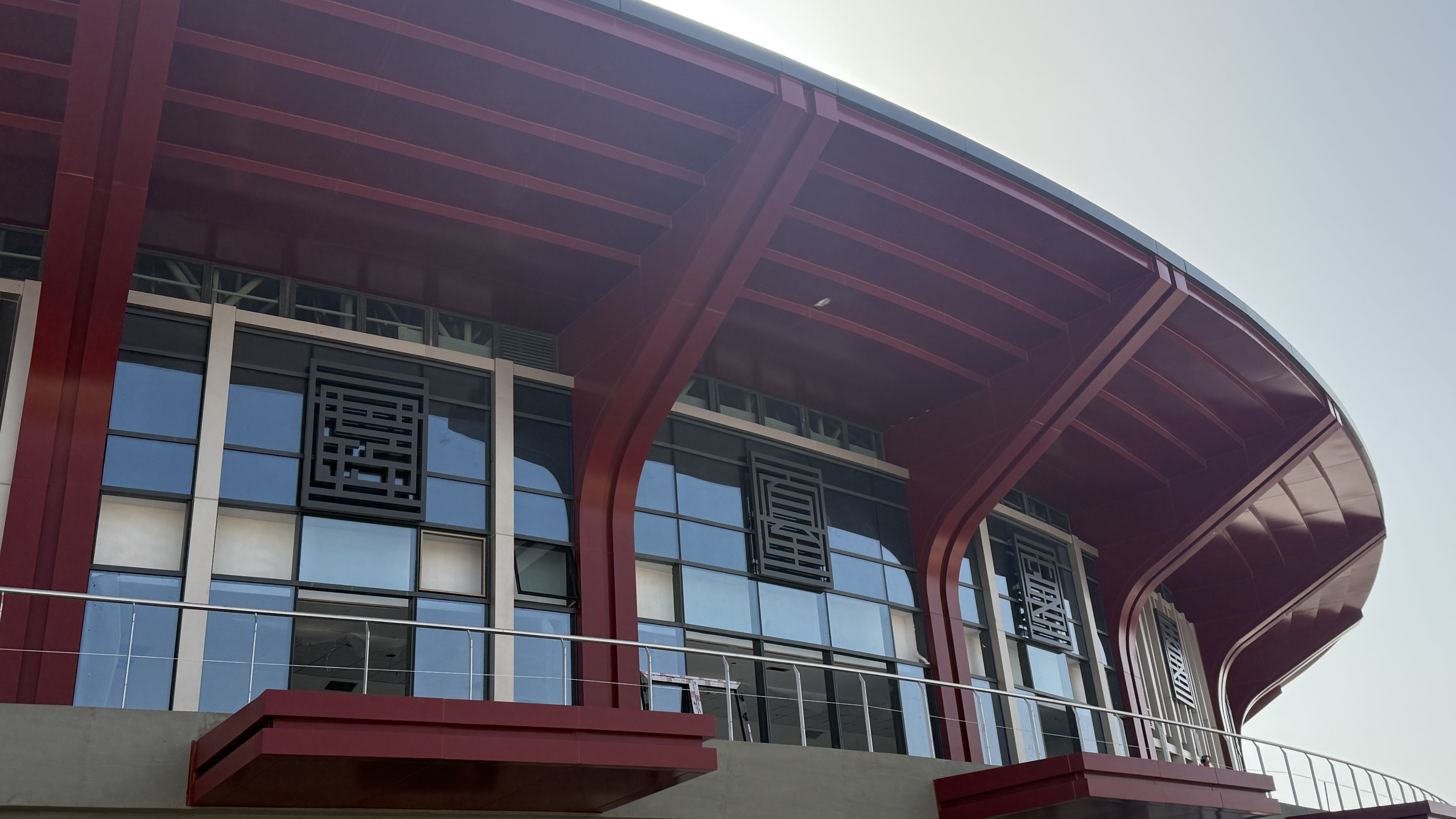 北京市工程咨询股份有限公司执行经理贾静超介绍,该项目主体建筑设计灵感来源于北京天坛祈年殿,采用两层重檐屋顶和简化的古建筑形式,兼顾功能的同时体现中式典雅与现代简约风格。建筑立面融合传统建筑的起檐、斗拱及窗格元素,并以二十四节气及五行方位符号装饰,丰富视觉效果与室内光影层次。室内观众厅东墙设有“五星出东方利中国”织锦浮雕,寓意吉瑞。此外,主体建筑呈椭圆形,抽象表现当地特产墨玉,象征历史与现代的融合。