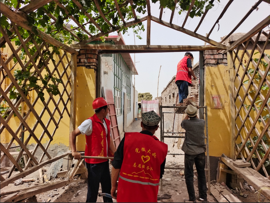 图:阿克陶县玉麦镇霍伊拉艾日克村驻村工作队队员帮助村民维修房门。