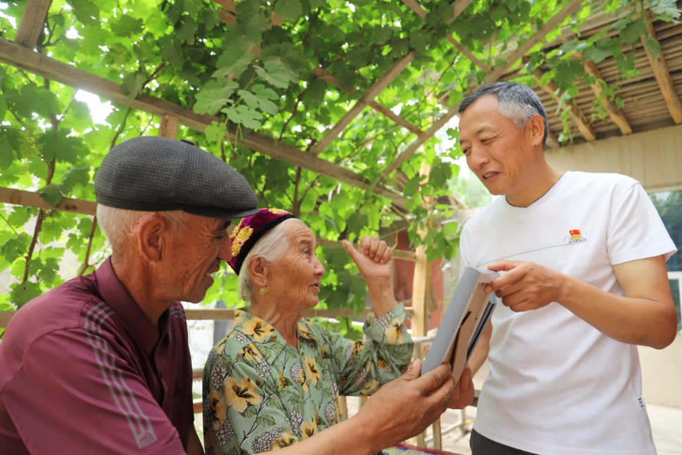 图:疏勒县英阿瓦提乡安居尔村驻村工作队队员为村民送上母亲节纪念照。
