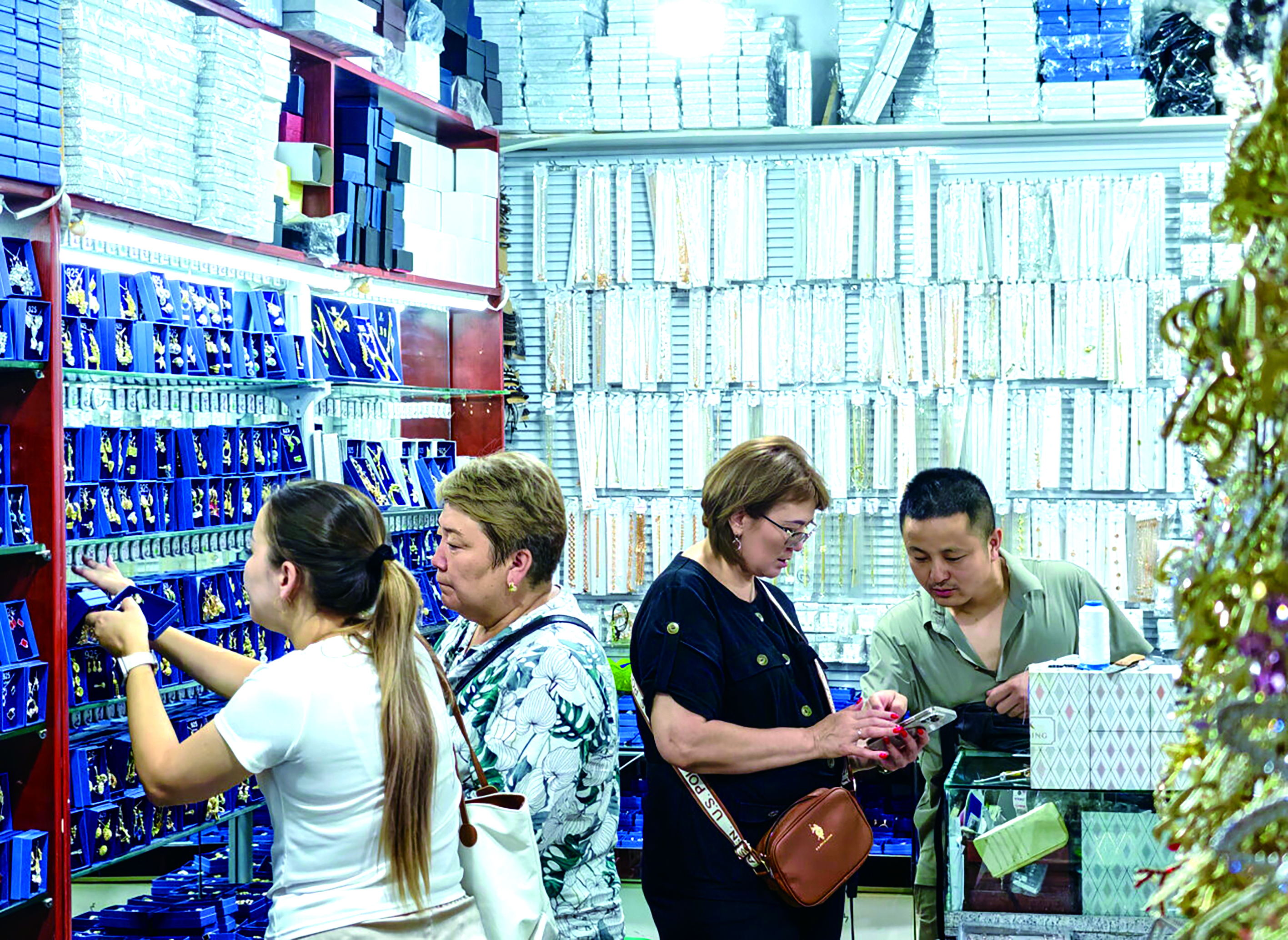 在位于霍尔果斯市的中国(新疆)自由贸易试验区霍尔果斯片区,境外客商在采购商品。周鹏/摄