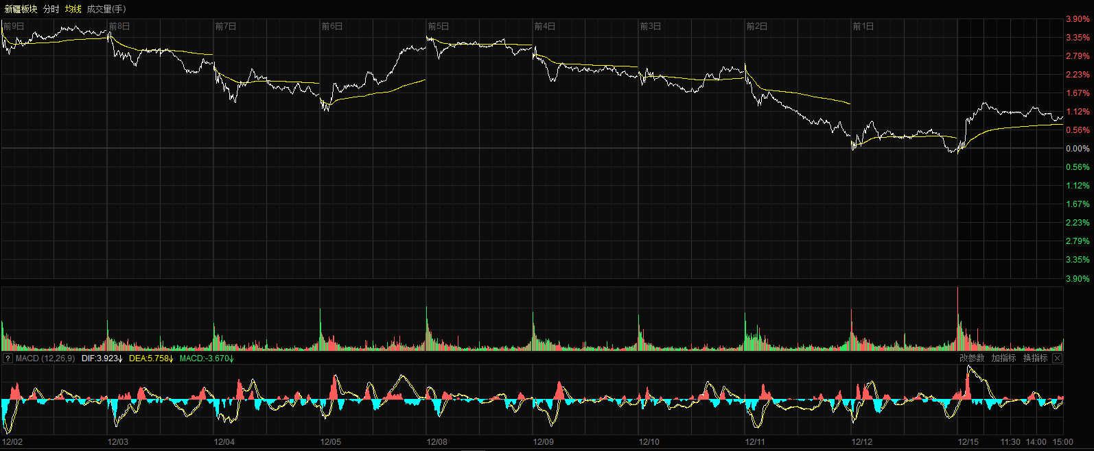 12月15日收盘时,新疆板块指数涨0.93%,报收21603.98点,39只股票上涨,18只股票下跌,4只股票平盘,个股上涨比例为63.93%,总换手率1.78%,总成交额232.59亿元。