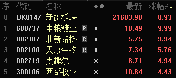 其中,中粮糖业上涨9.99%,报收18.49元;北新路桥上涨9.94%,报收5.75元;天康生物上涨5.76%,报收7.34元;麦趣尔上涨4.94%,报收8.71元;西部牧业上涨4.43%,报收10.84元。博纳影业、合金投资、百花医药、特变电工、天富能源跌幅居前。