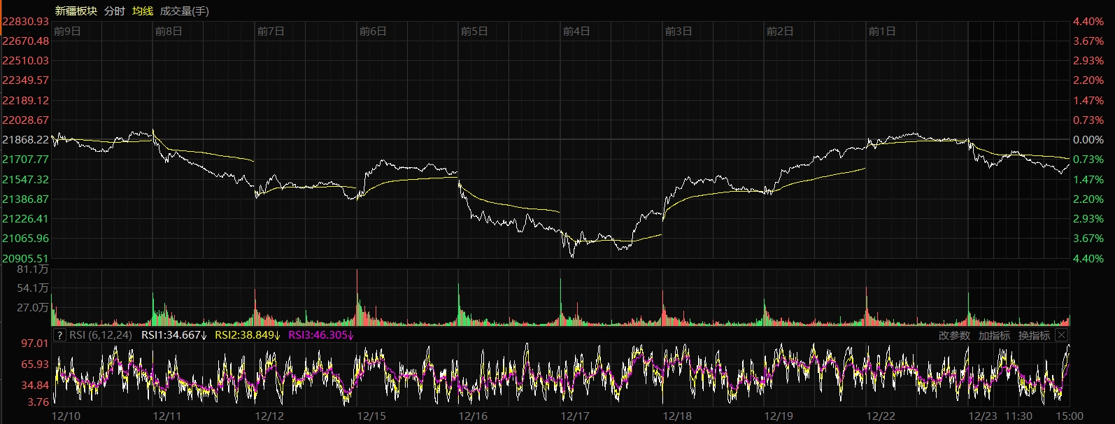 12月23日收盘时,新疆板块指数跌0.93%,报收21663.82点,13只股票上涨,46只股票下跌,2只股票平盘,个股上涨比例为21.31%,总换手率1.30%,总成交额165.10亿元。