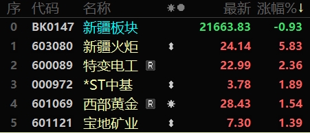 其中,新疆火炬上涨5.83%,报收24.14元;特变电工上涨2.36%,报收22.99元;*ST中基上涨1.89%,报收3.78元;西部黄金上涨1.54%,报收28.43元;宝地矿业上涨1.39%,报收7.30元。博纳影业、汇嘉时代、麦趣尔、天顺股份、科力股份跌幅居前。