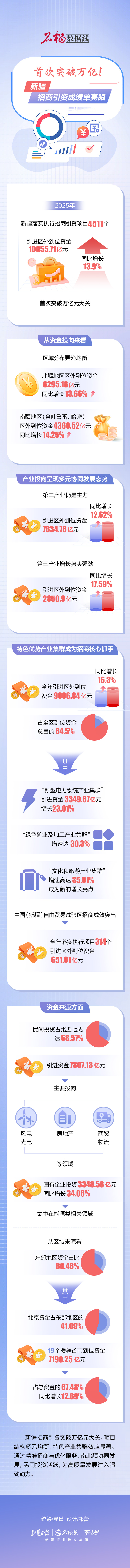 2025年新疆落实执行招商引资项目4511个,引进区外到位资金10655.71亿元,同比增长13.9%,首次突破万亿元大关。