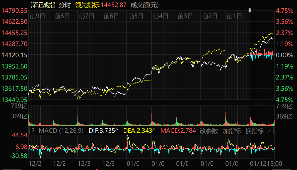 石榴云/新疆日报讯(记者 王永飞报道)A股三大指数今日继续强势表现,沪指日线17连阳再创逾十年新高。截至收盘,沪指涨1.09%,收报4165.29点;深证成指涨1.75%,收报14366.91点;创业板指涨1.82%,收报3388.34点。沪深京三市成交额达到36450亿元,较上一交易日大幅放量近5000亿元,创A股历史最大成交量。