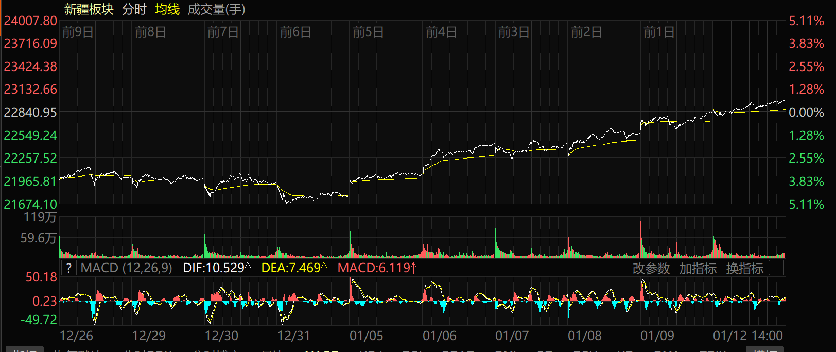 1月12日收盘时,新疆板块指数涨0.74%,报收23009.07点,35只股票上涨,24只股票下跌,3只股票平盘,个股上涨比例为56.45%,总换手率2.56%,总成交额406.58亿元。