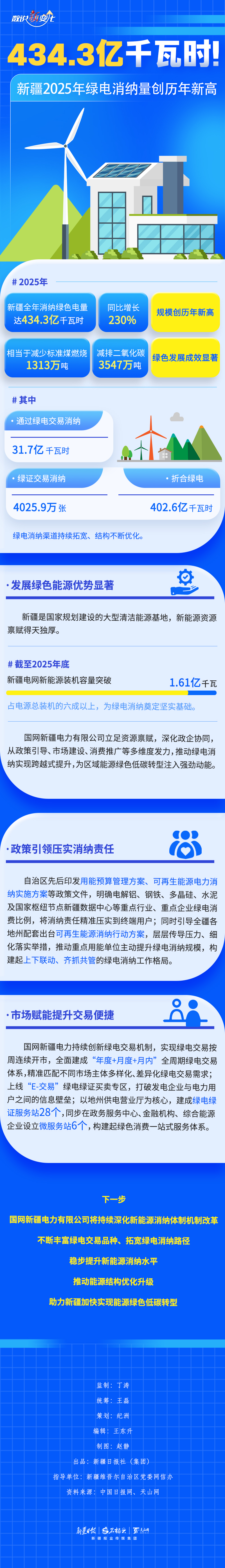 2025年,新疆全年消纳绿色电量达434.3亿千瓦时,较上年增长230%,规模创历年新高。亮眼数据是如何取得的?新疆在绿电消纳水平提升、能源绿色低碳转型方面做了哪些努力?今天的《数说“新”变化》一起来看看。