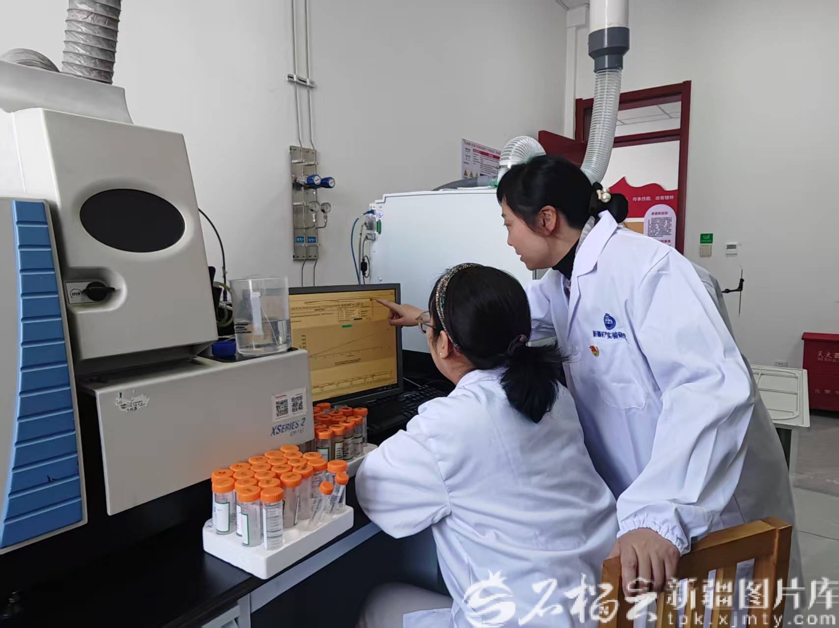2月11日,自治区地质局矿产实验研究中心生产技术科科长余蕾(右一)正带领“余蕾创新工作室”成员进行矿石中微量元素的检测。石榴云/新疆日报记者 王亚芸 摄