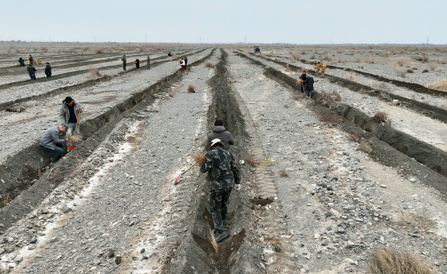 2月28日,墨玉县北部防沙治沙水源工程(一期)建设现场。刘绍斌摄