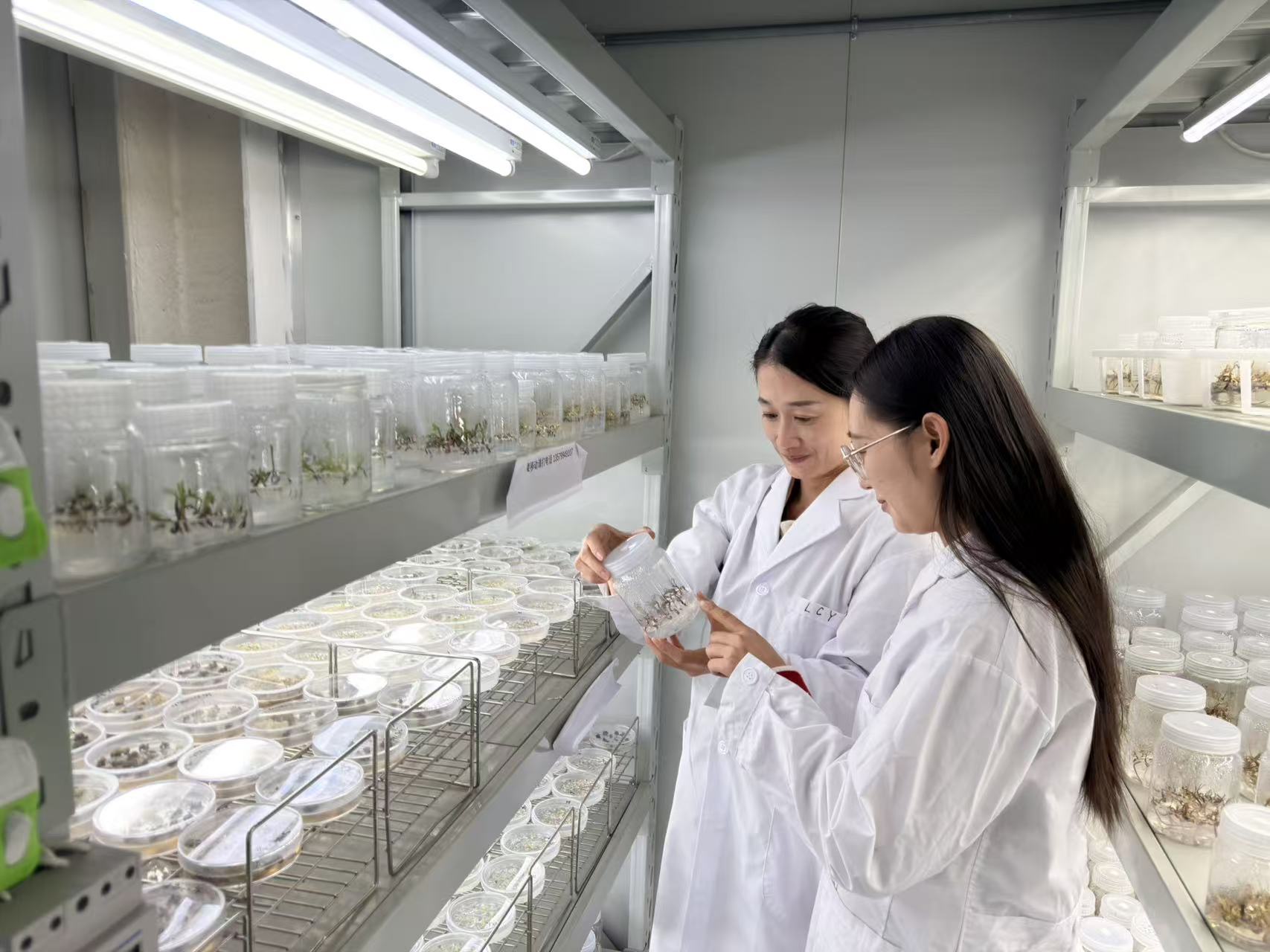 科研人员观察新疆阿魏组培苗的生长状态。自治区农科院供图。