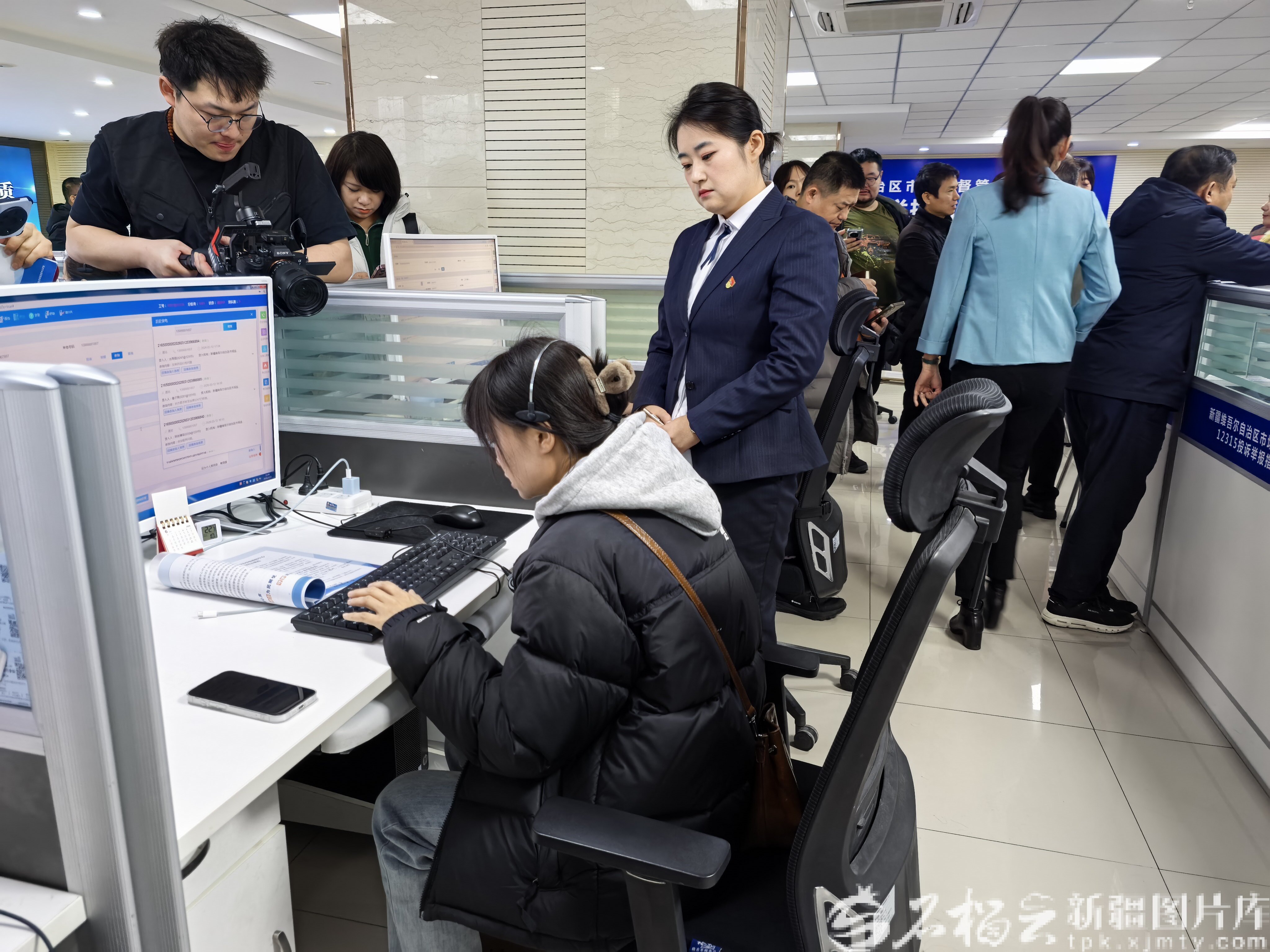 3月13日上午,在自治区12315投诉举报指挥中心,一位企业代表体验接线员工作。石榴云/新疆日报记者 索蓉芝摄
